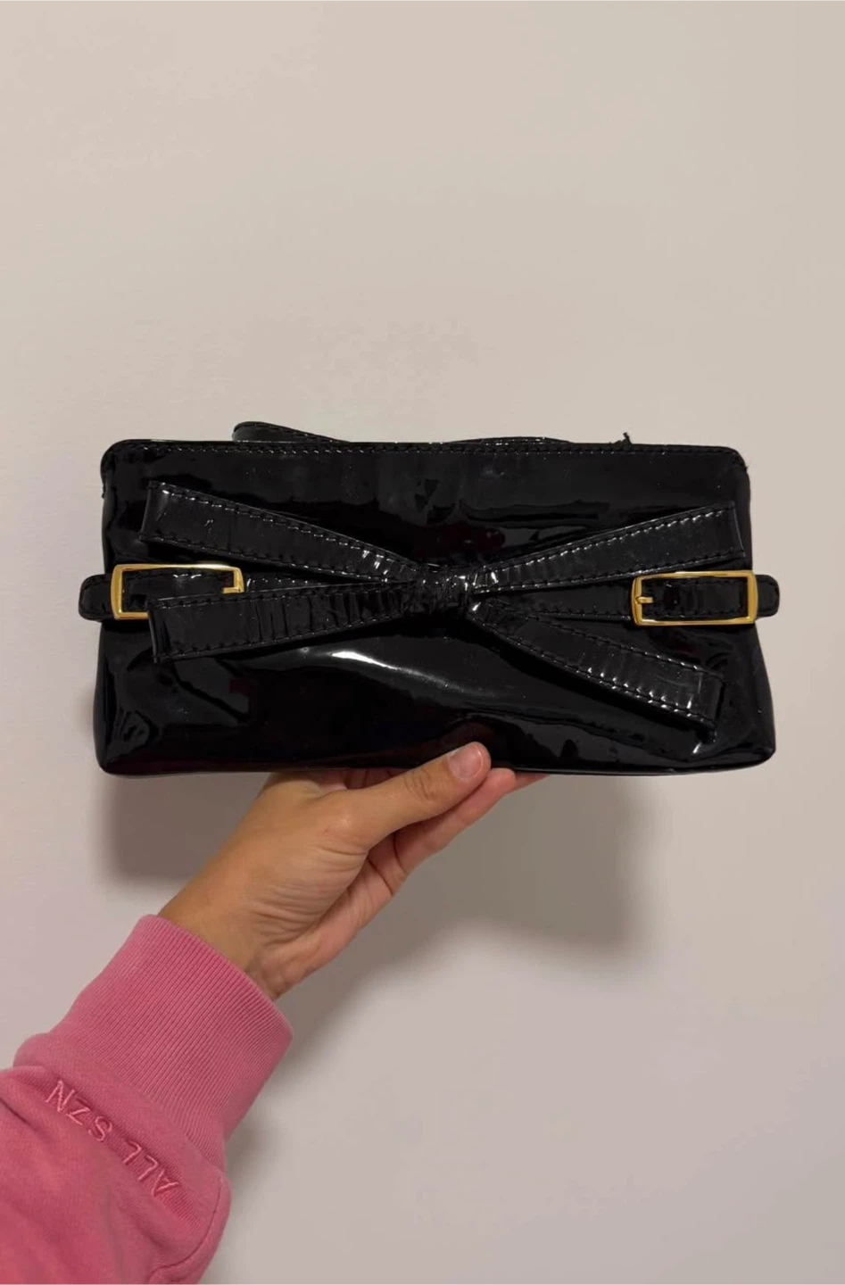 Here's a sleek Valentino clutch up for grabs! It's made of black patent leather and features a stylish bow detail. Perfect for adding a touch of elegance to any outfit