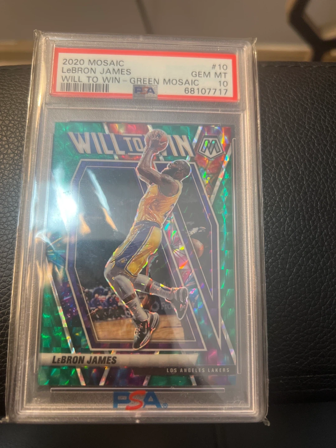 Selling a LeBron James 2020 Mosaic Will to Win - Green Mosaic card. It's graded PSA 10, so you know it's in great condition! This card is from the 2020-21 Panini Mosaic Basketball series.