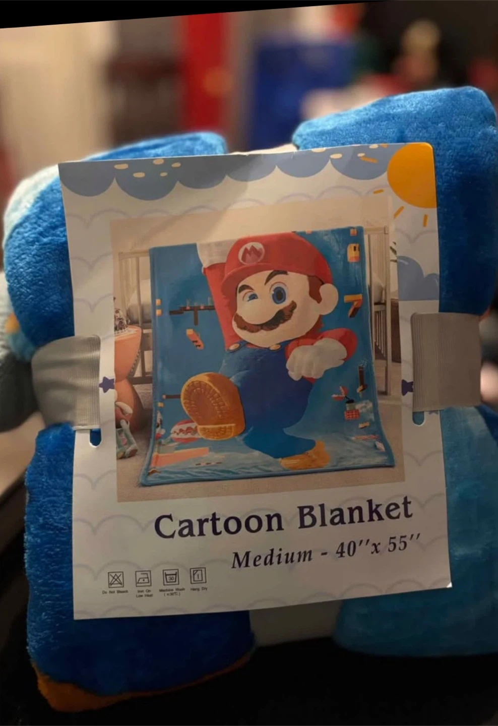 Selling a brand new Nintendo Super Mario cartoon blanket! It's a medium size, measuring 40" x 55". The blanket is a fun blue color and features a cool Super Mario design. Perfect for any Mario fan!