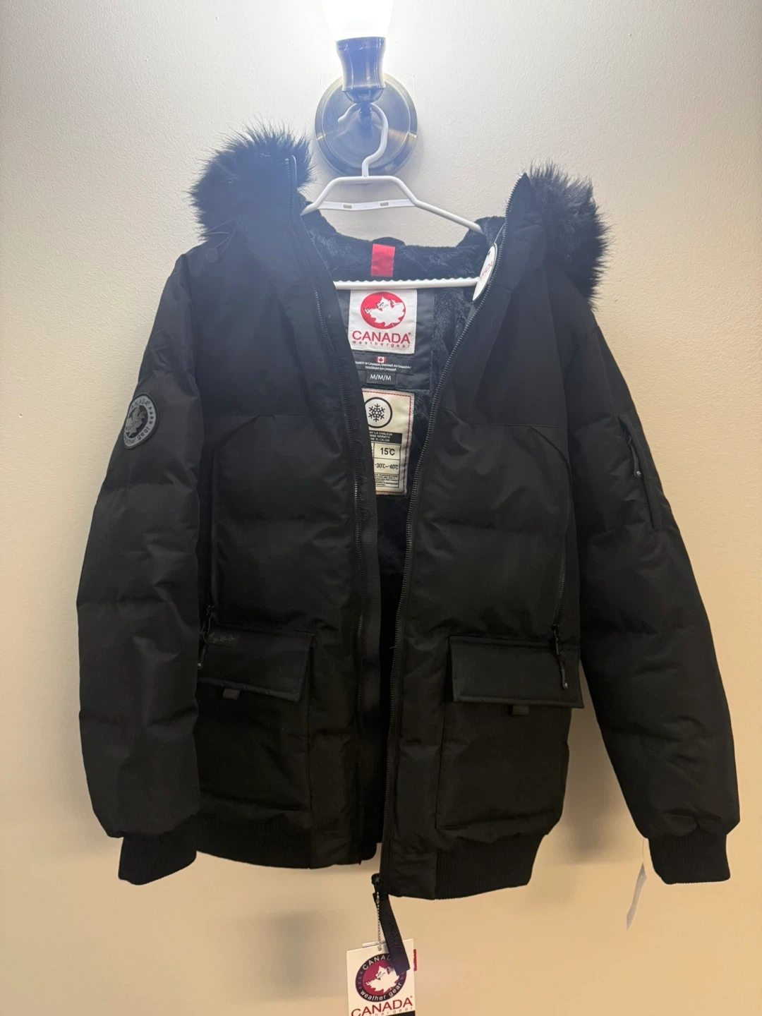 I'm selling a black winter jacket from Canada Weather Gear. It's a size M. This jacket is perfect for keeping warm in temperatures as low as -30°C! Also brand new, never worn.