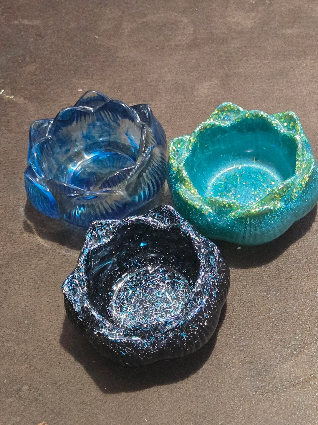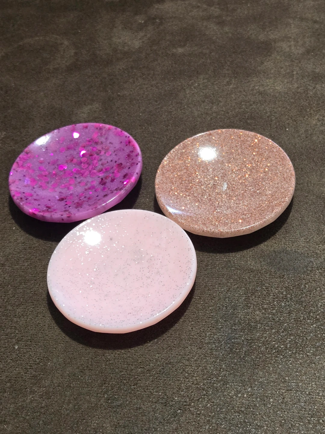Selling a set of handmade resin trinket dishes. These are perfect for holding jewelry, keys, or other small items. Each dish has a unique design and colour, adding a touch of sparkle to any space!