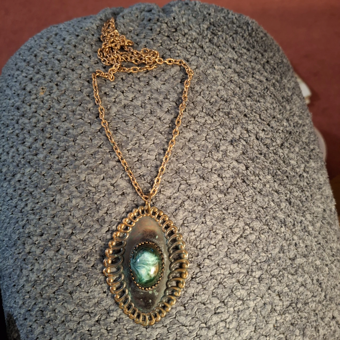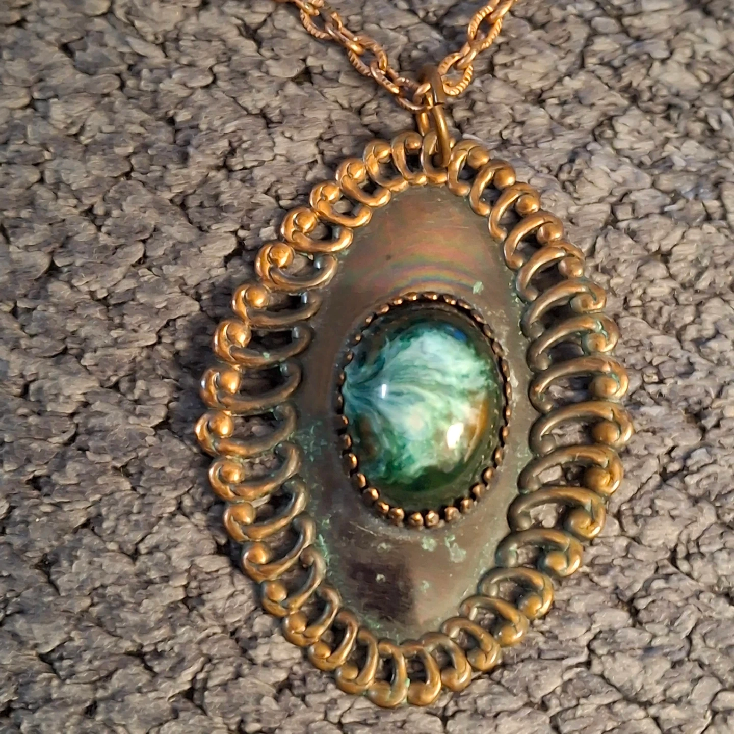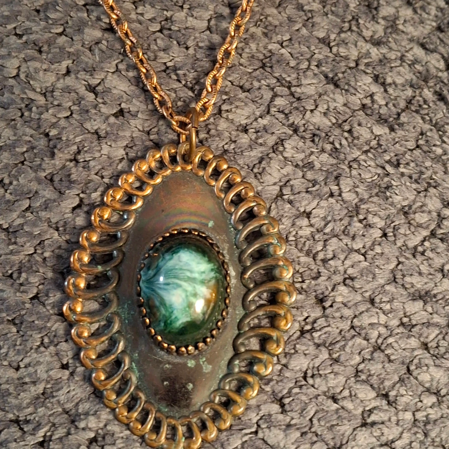 Selling this vintage oval pendant necklace. It features a green and white marbled stone in the center, surrounded by a decorative, textured metal border. The chain is a matching copper colour. It's a unique piece to add to your collection!