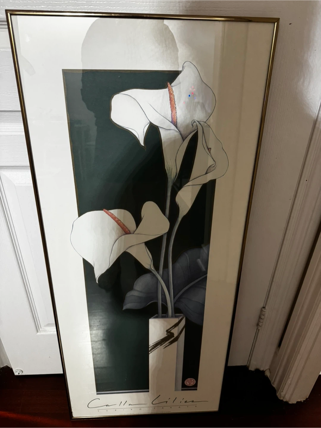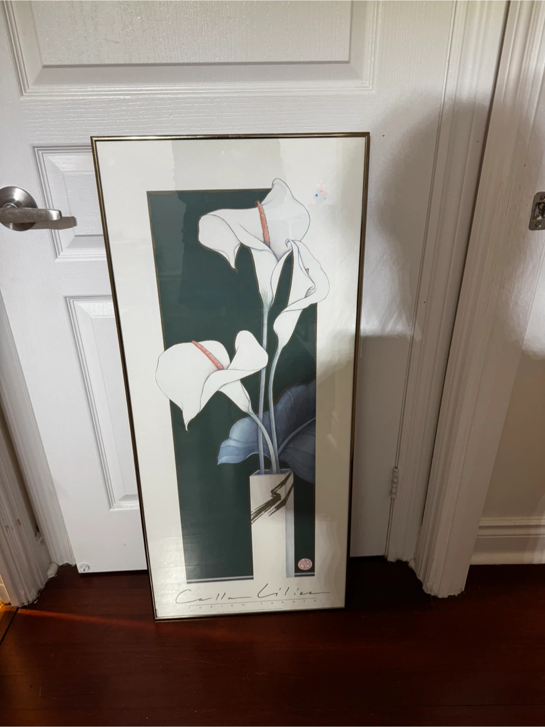 Selling a framed art print featuring calla lilies. It's a lovely piece that would look great in any room. The frame is a simple gold tone.