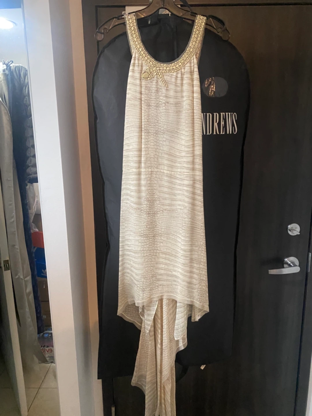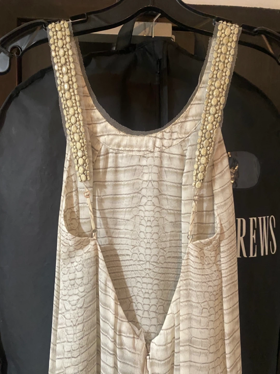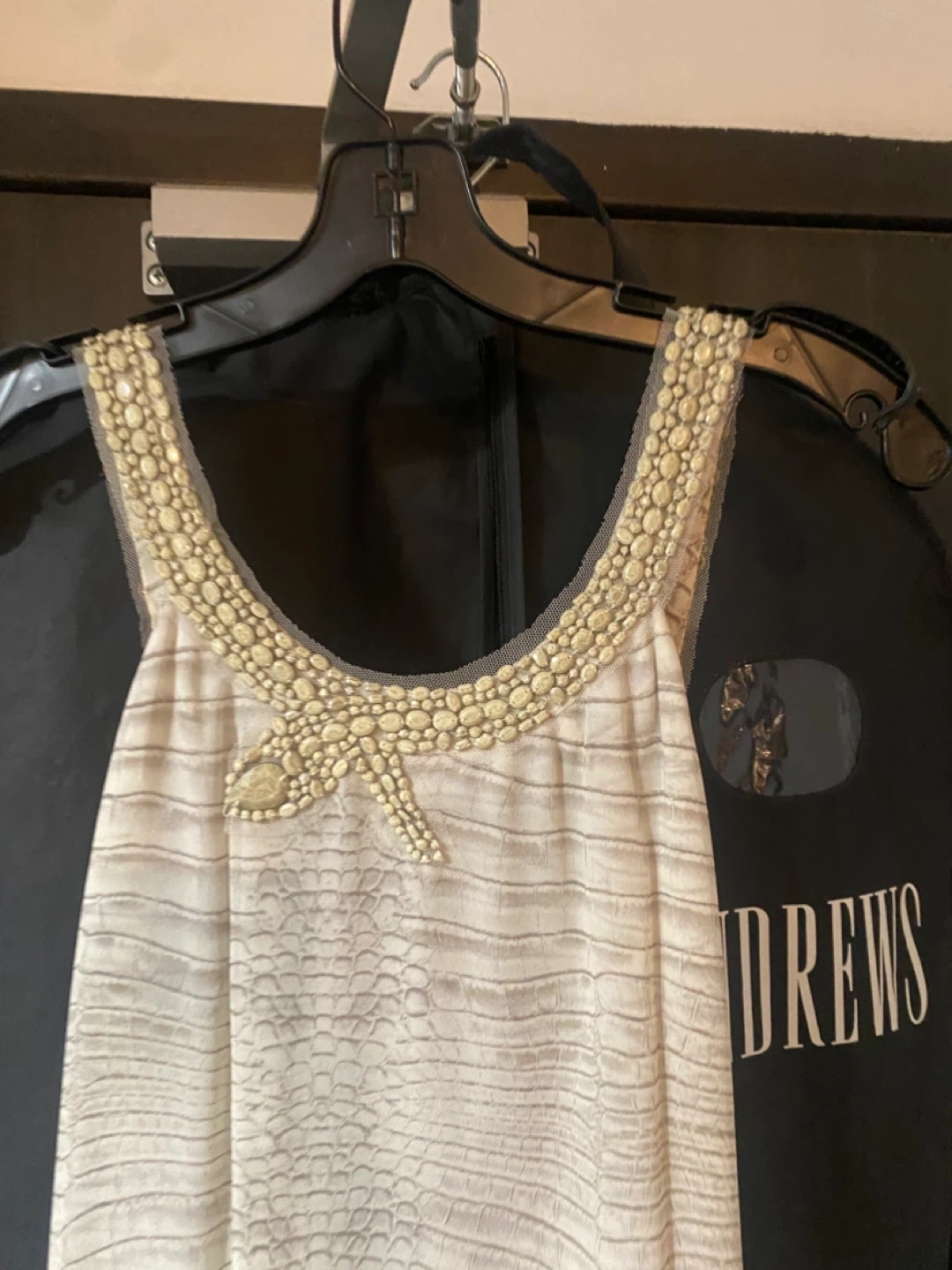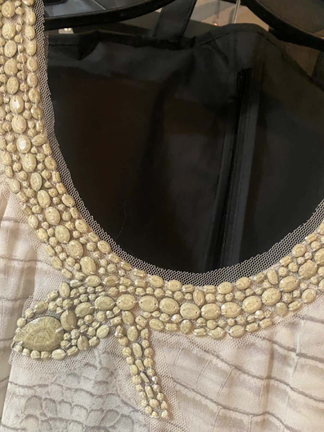Selling a lovely designer dress in white /greyish colour. It features a unique beaded neckline that adds a touch of elegance. Perfect for a special occasion or a night out! Purchased at Andrew‘s in Yorkville. It’s beautifully on the body and beautiful movement, when you walk in the dress, stunning
