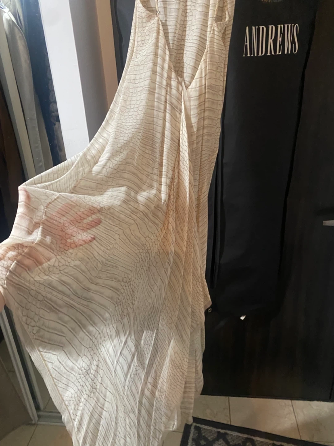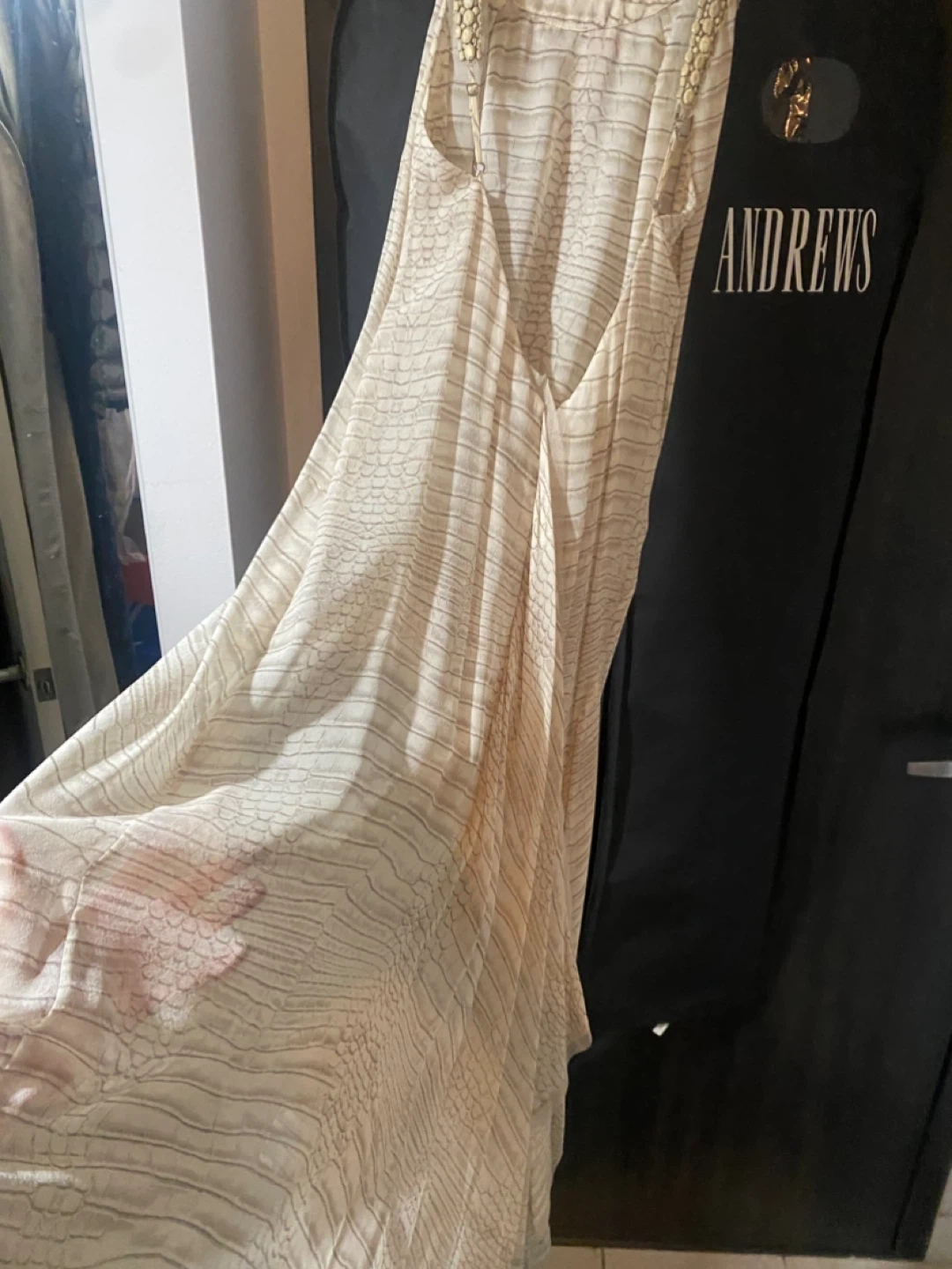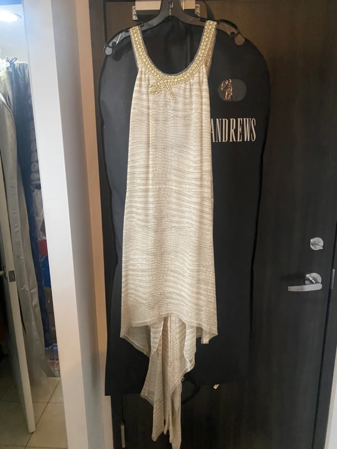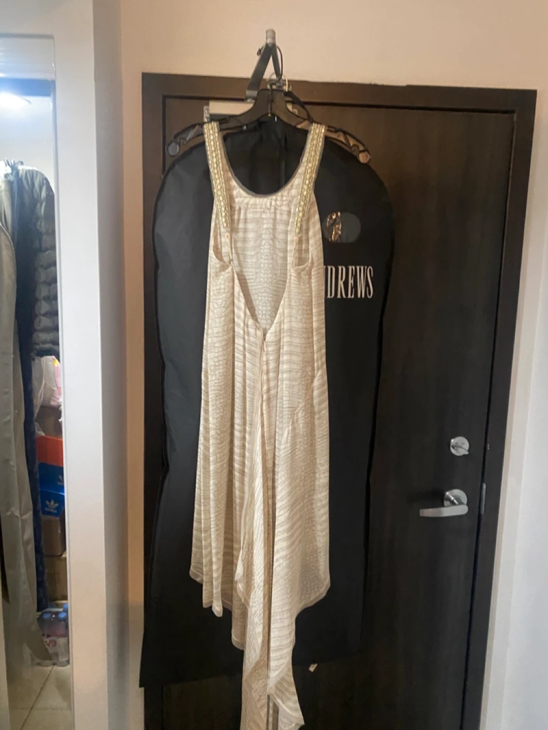 Selling a lovely designer dress in white /greyish colour. It features a unique beaded neckline that adds a touch of elegance. Perfect for a special occasion or a night out! Purchased at Andrew‘s in Yorkville. It’s beautifully on the body and beautiful movement, when you walk in the dress, stunning