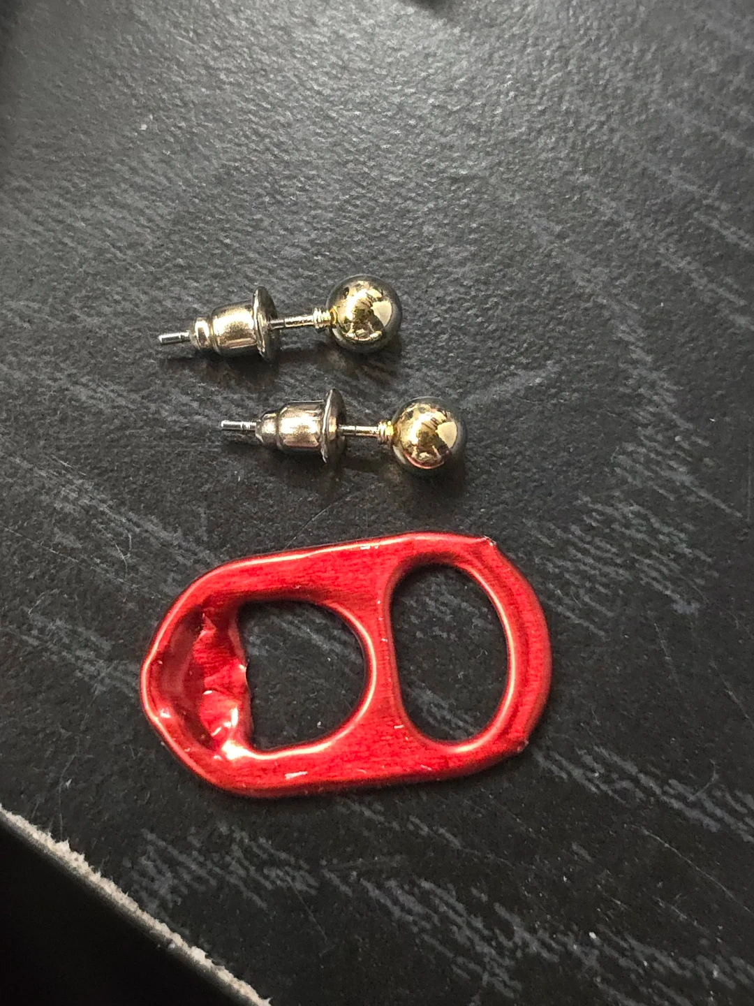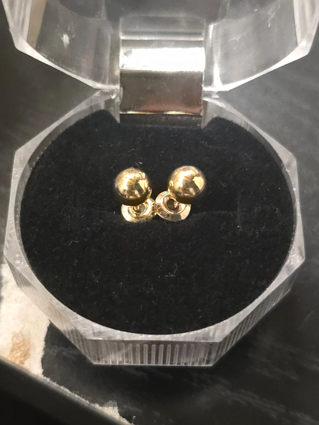 Selling a pair of gold ball stud earrings. These are simple and classic, great for everyday wear or dressing up an outfit. Gold plated hypoallergenic stainless steel, never used, tab for scale.