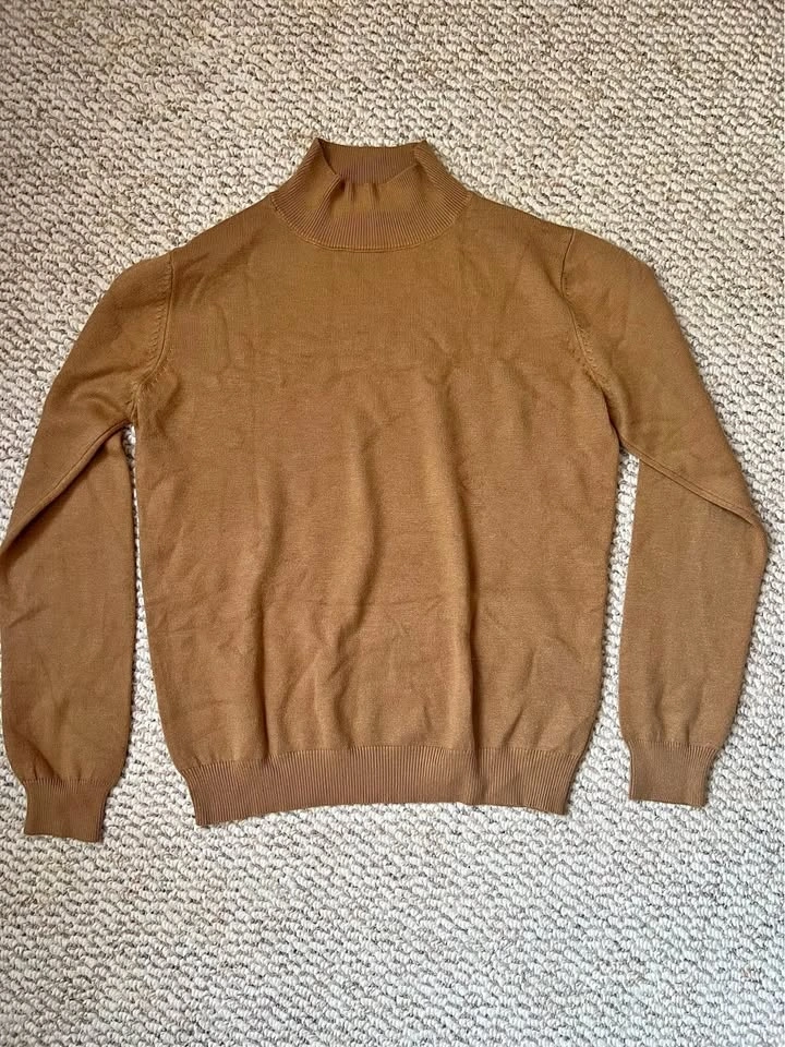 Stay warm and stylish with this classic light brown turtleneck sweater. Perfect for any occasion.