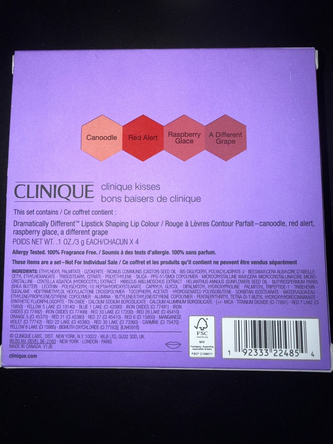 Selling a Clinique Kisses lipstick set! This set contains 4 Dramatically Different Lipstick Shaping Lip Colours in the shades Canoodle, Red Alert, Raspberry Glace, and A Different Grape. Each lipstick is .1 oz / 3 g. It's fragrance free and allergy tested!