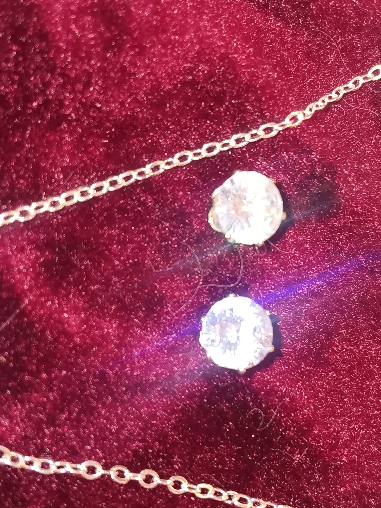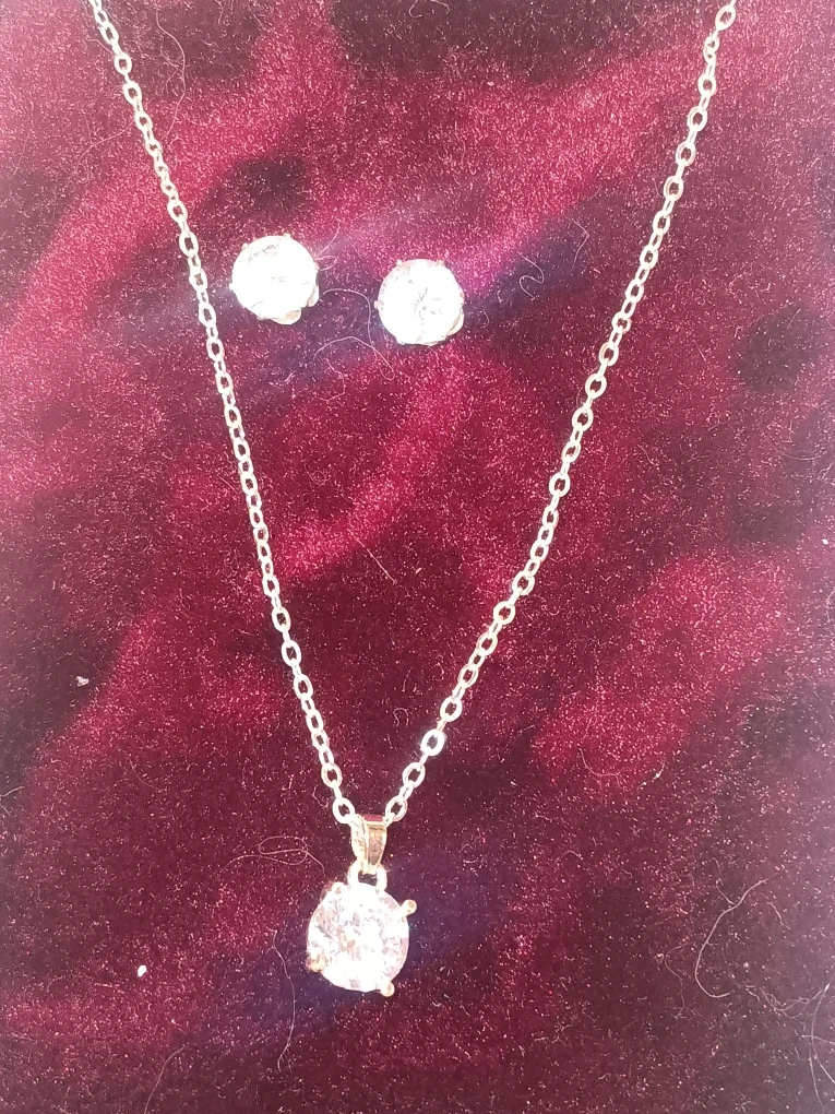 Selling a cute necklace and earrings set. The necklace has a dainty chain and a sparkly pendant, and the earrings are matching studs. They're in great condition and would be perfect for dressing up any outfit!