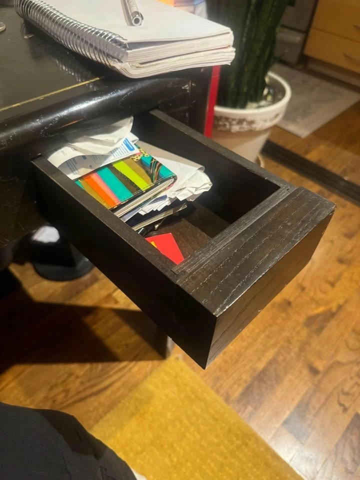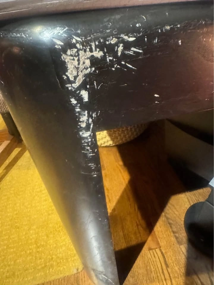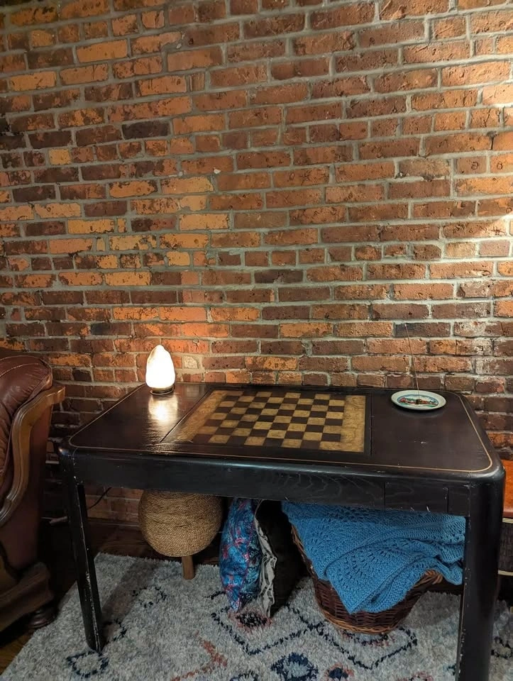 A stunning vintage piece with a dark wood finish and exceptional stability. This versatile table features a hidden drawer for game pieces (game pieces not included) and can double as an office desk.