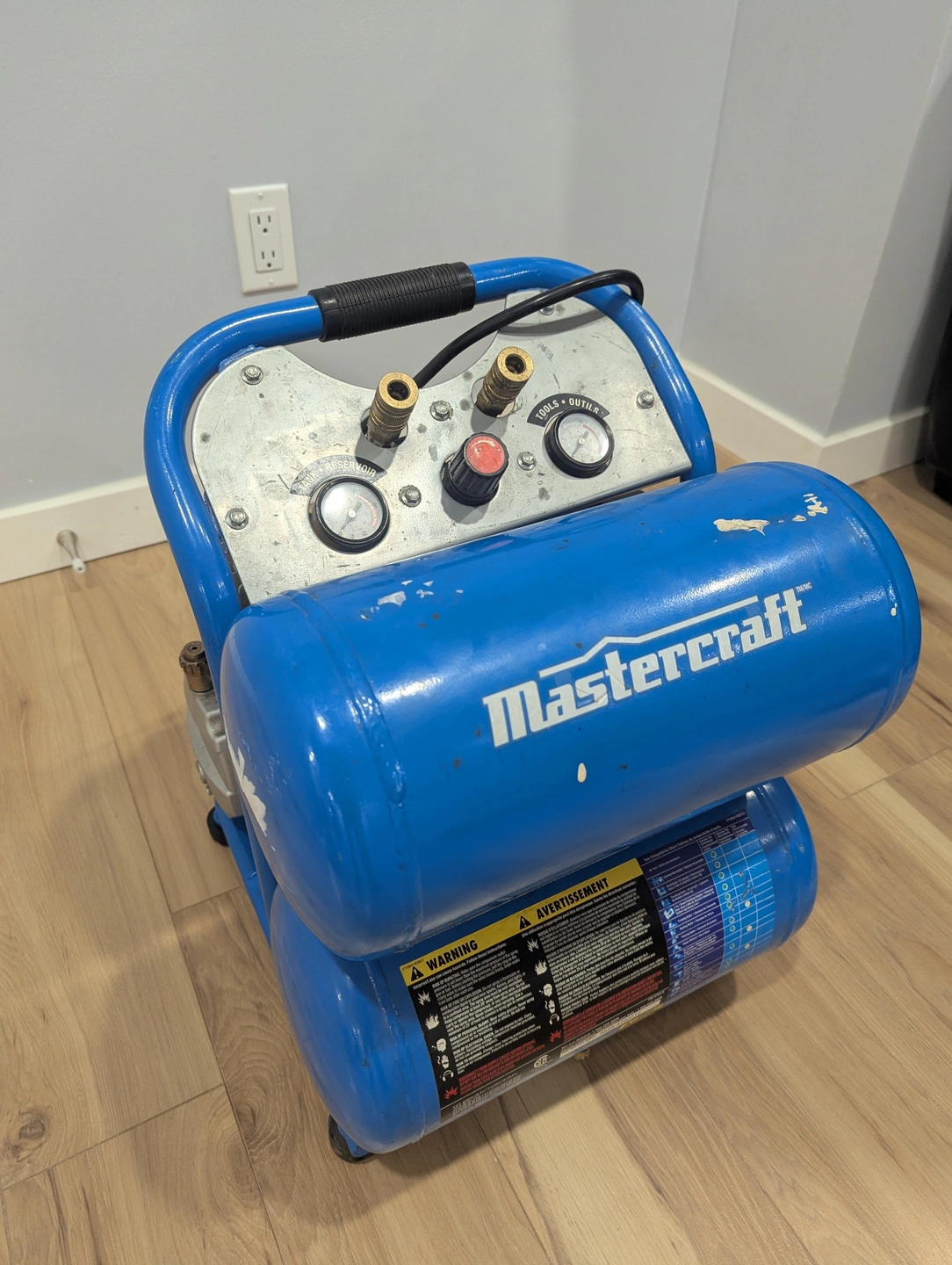 Mastercraft 5 Gallon Air Compressor features 135 max PSI, 1.5 running HP and is oil free for less maintenance