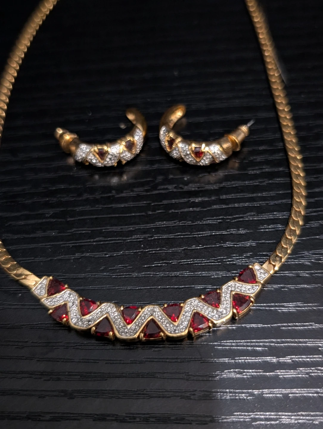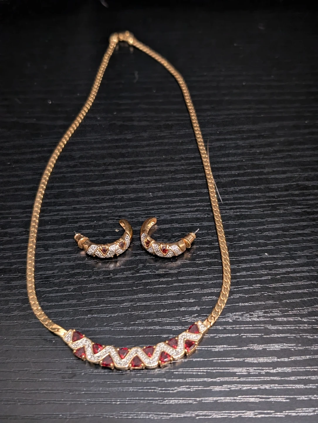 Selling a vintage necklace and earring set. This set has a gold tone and features red and clear stones. It's a beautiful set for adding a touch of elegance to any outfit