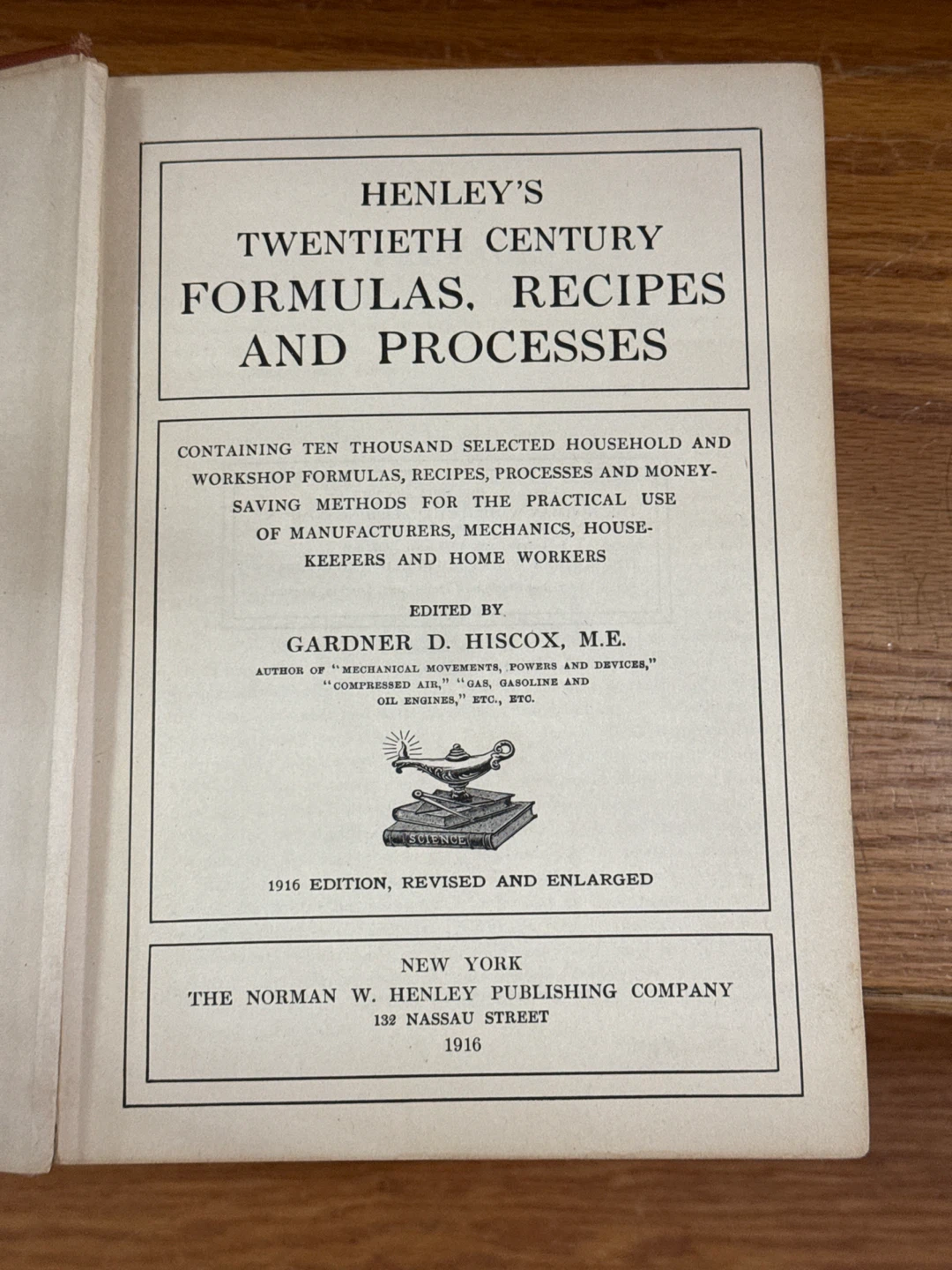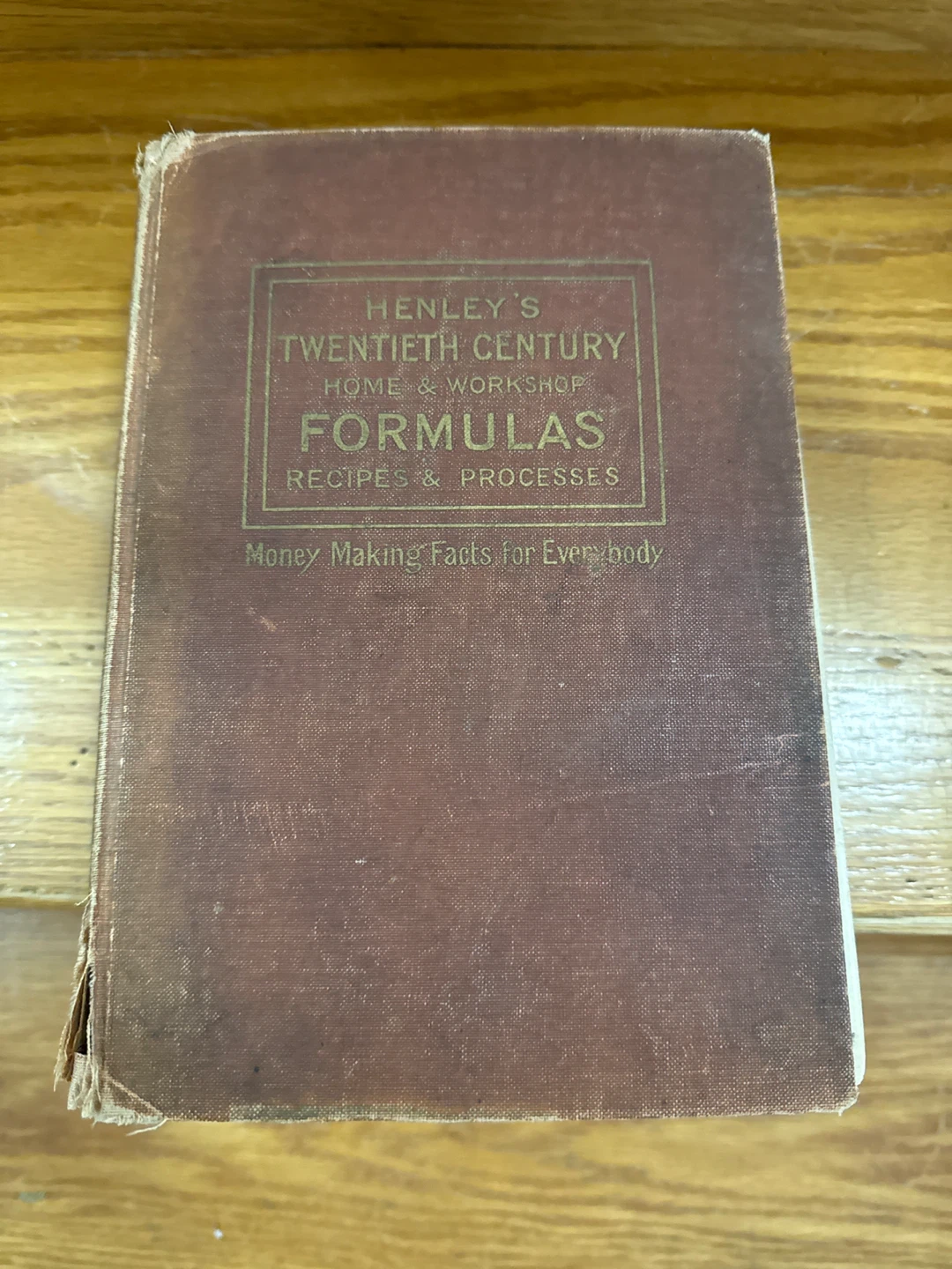 Selling a copy of Henley's Twentieth Century Formulas, Recipes and Processes from 1916. It contains ten thousand selected household and workshop formulas, recipes, processes and money-saving methods for the practical use of manufacturers, mechanics, housekeepers and home workers. Fabulous way to learn the original methods of doing almost anything. Edited by Gardner D. Hiscox, M.E.