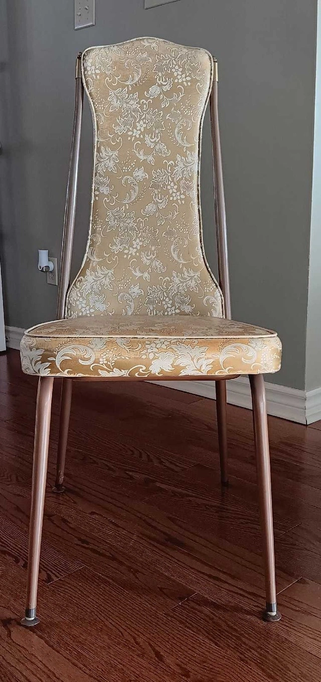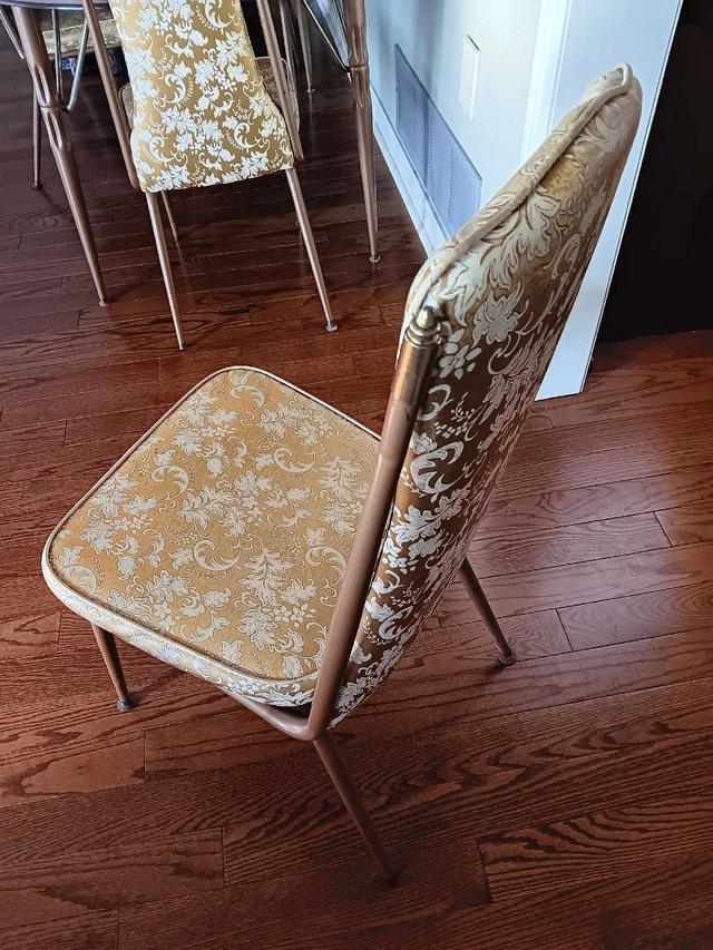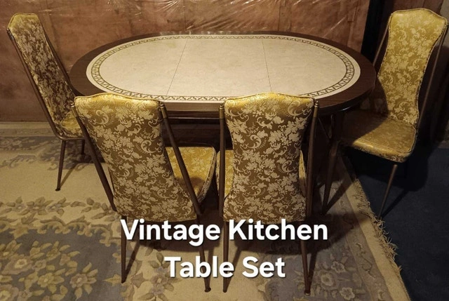Vintage kitchen table with 4 chairs. Great condition. 41.5" wide x 58.5" long including a 17.5" insert. Table will be round when insert is removed. Estate sale. $55 for the set.