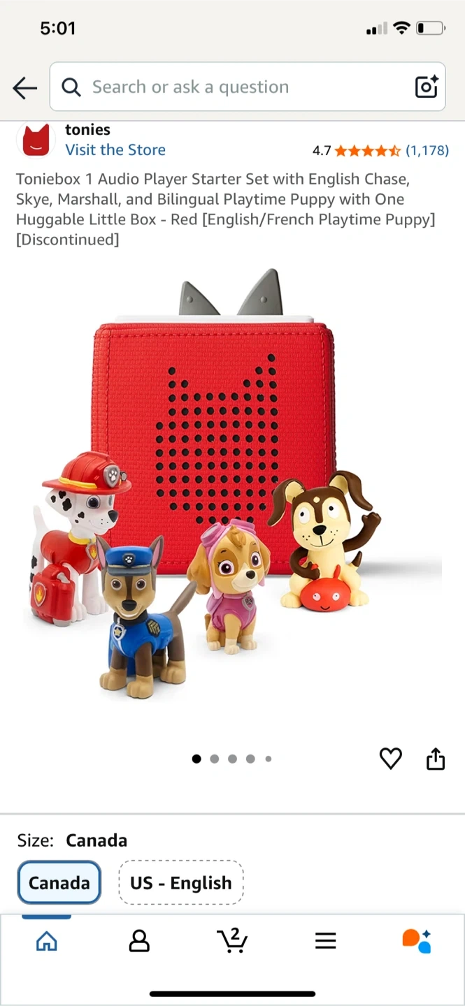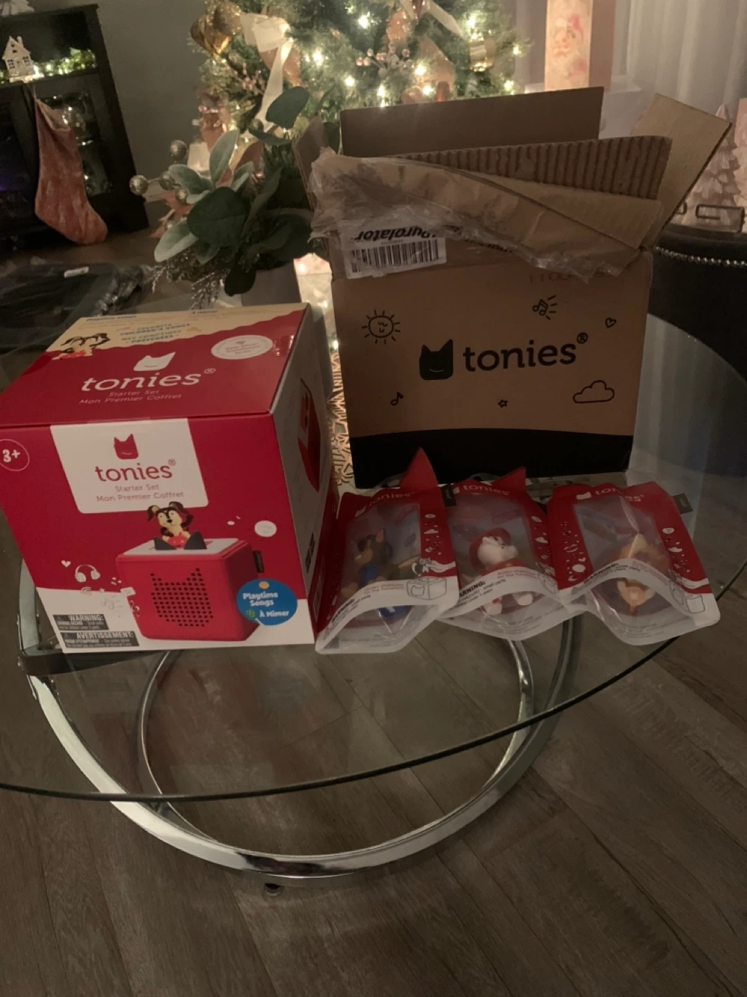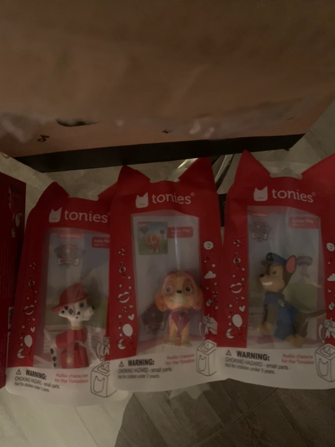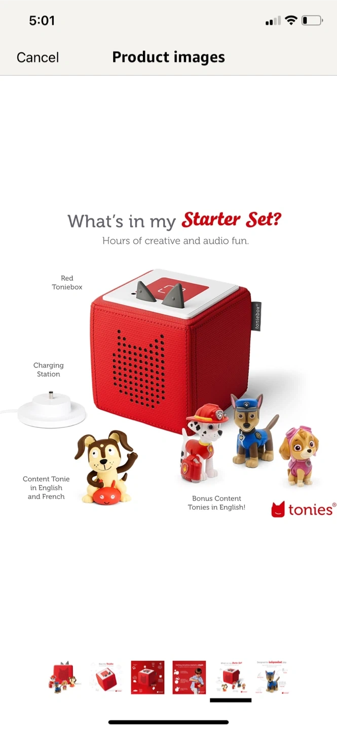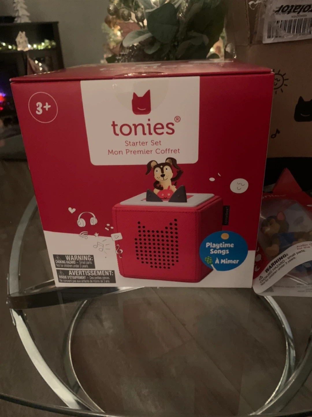 Bundle includes a red Toniebox, charging station, English Chase, English Skye, English Marshall, and Bilingual (English/French) Playtime Puppy Tonies. Additional Tonies can be purchased separately.