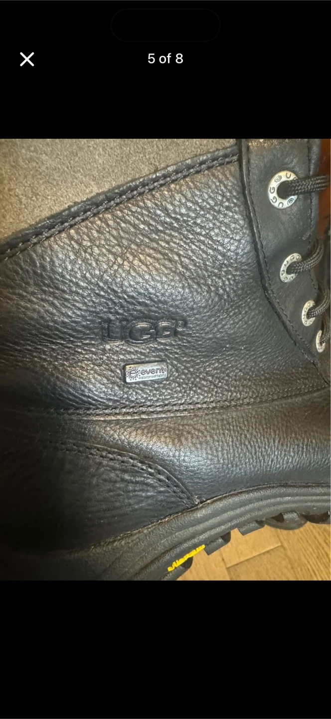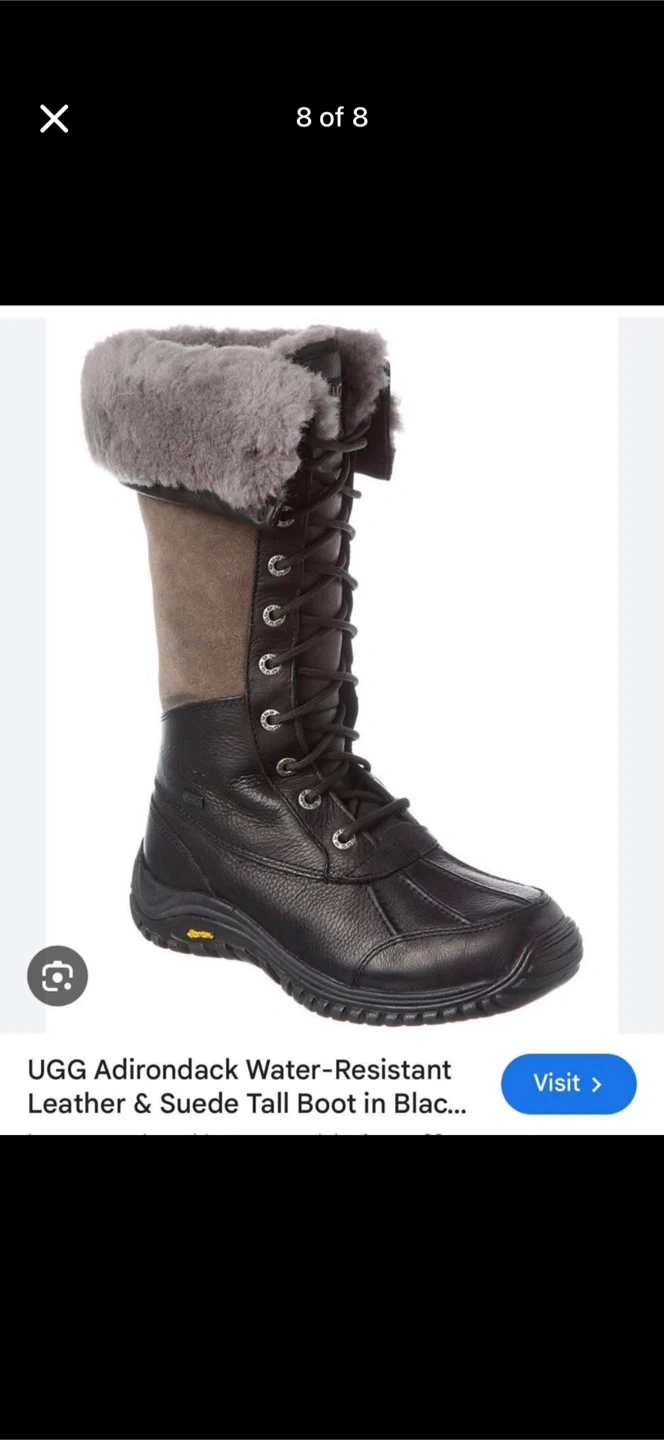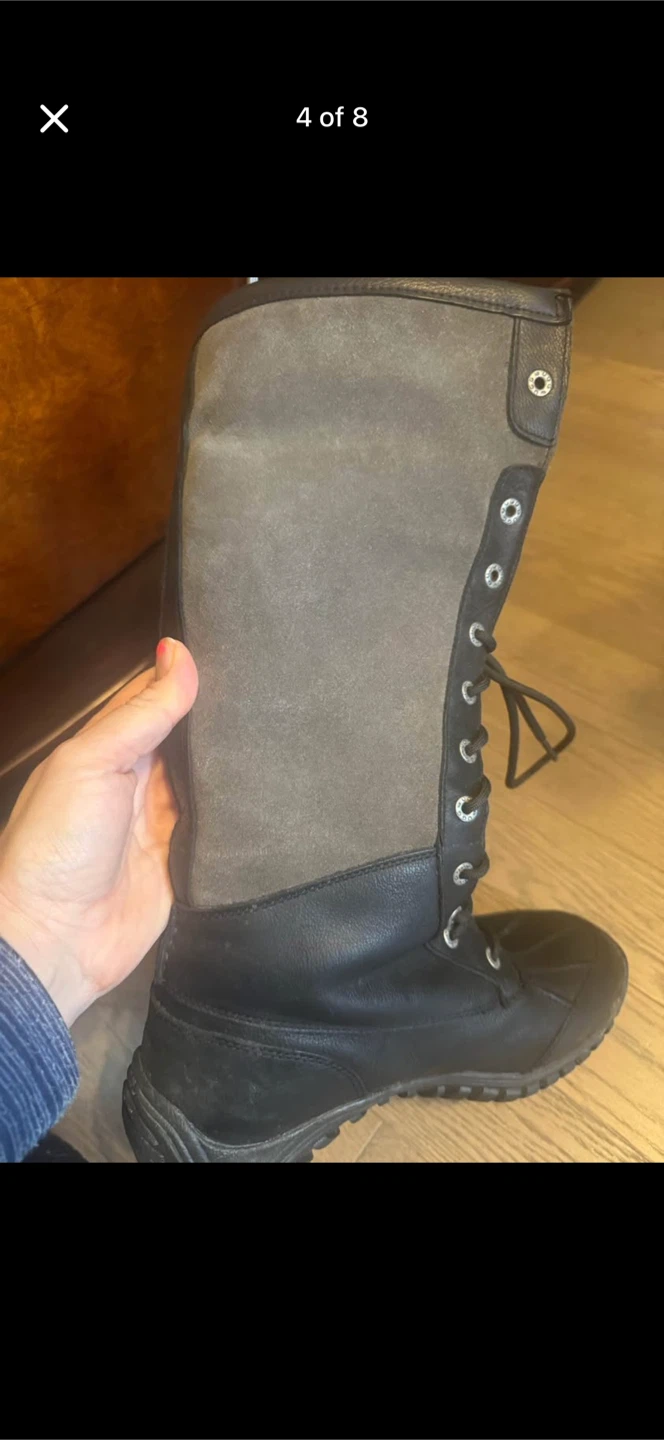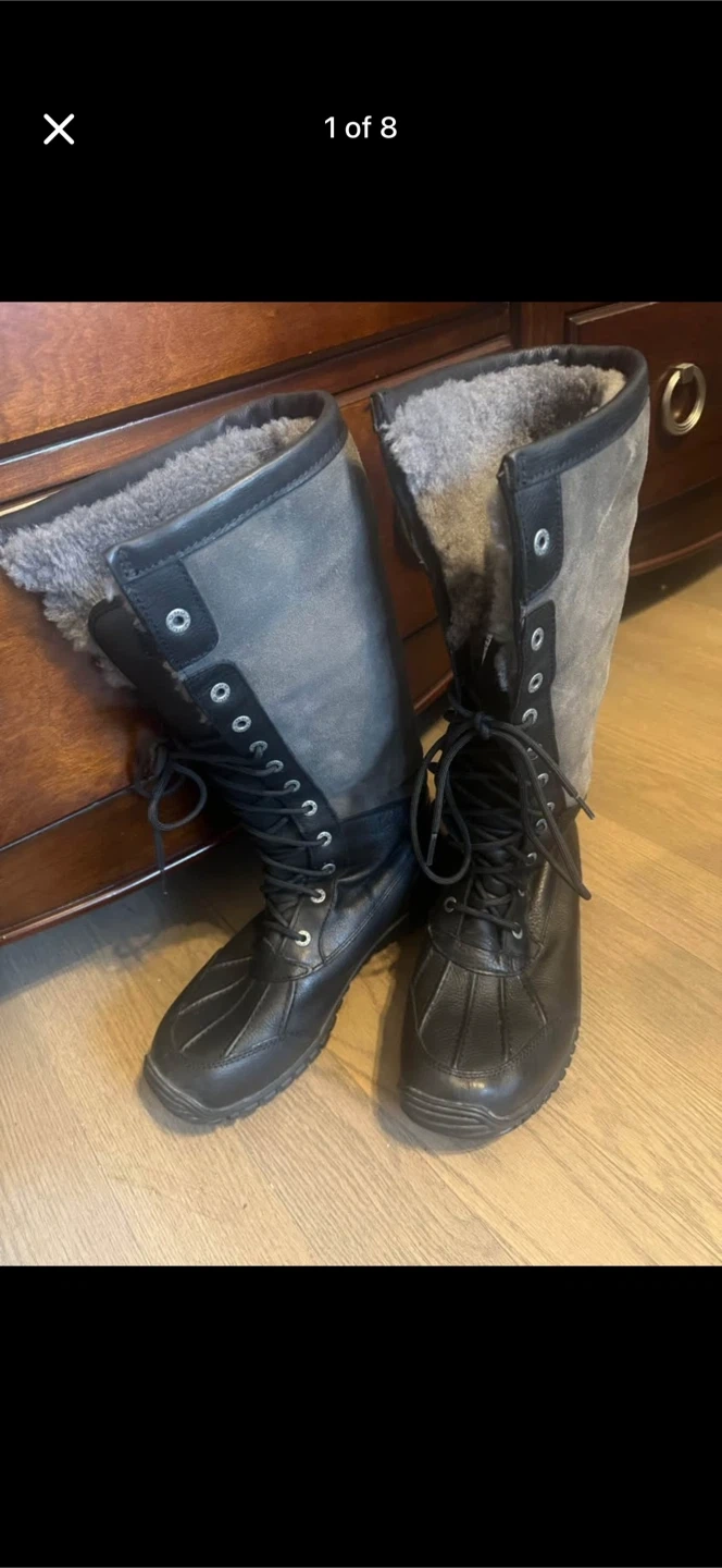 Selling a pair of UGG Adirondack tall boots in black. They feature a leather and suede upper with a lace-up design. The soles are made by Vibram for great traction. Perfect for winter!