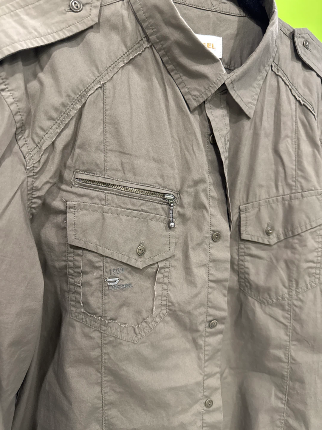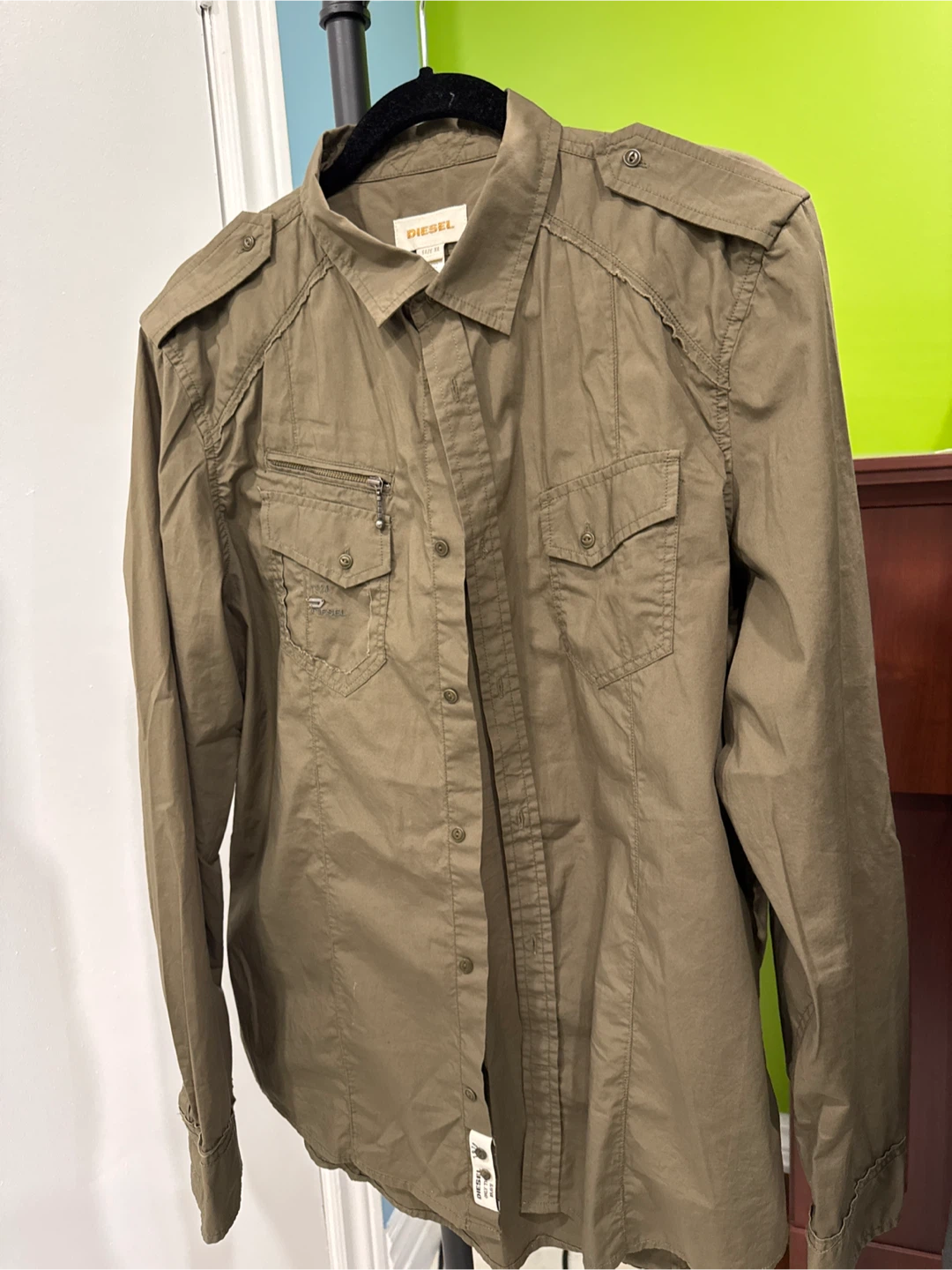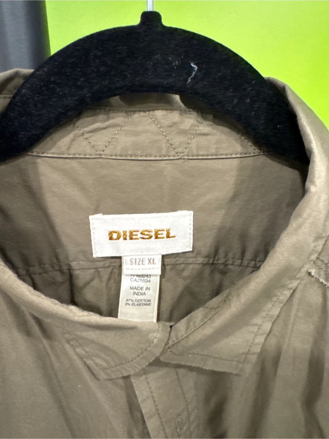 Diesel button-up shirt in size XL! This olive green shirt is made of 97% cotton and 3% elastane. Great for a casual or dressed-up look