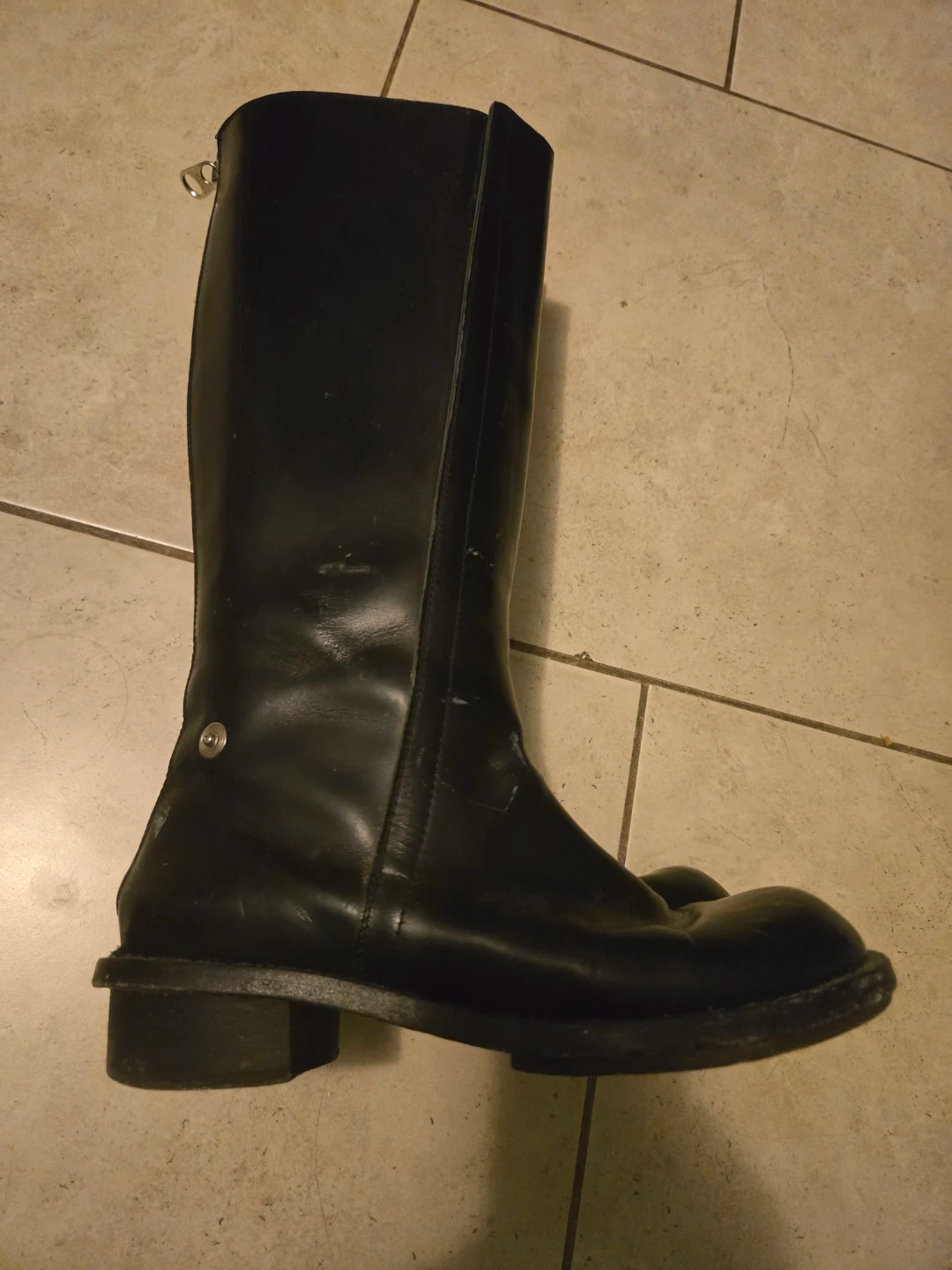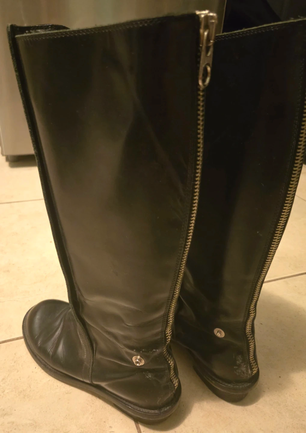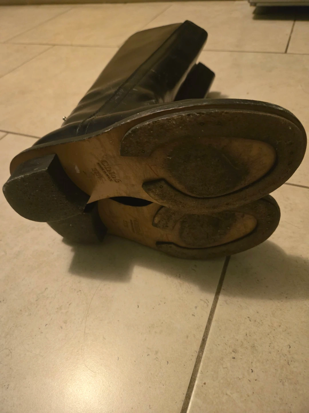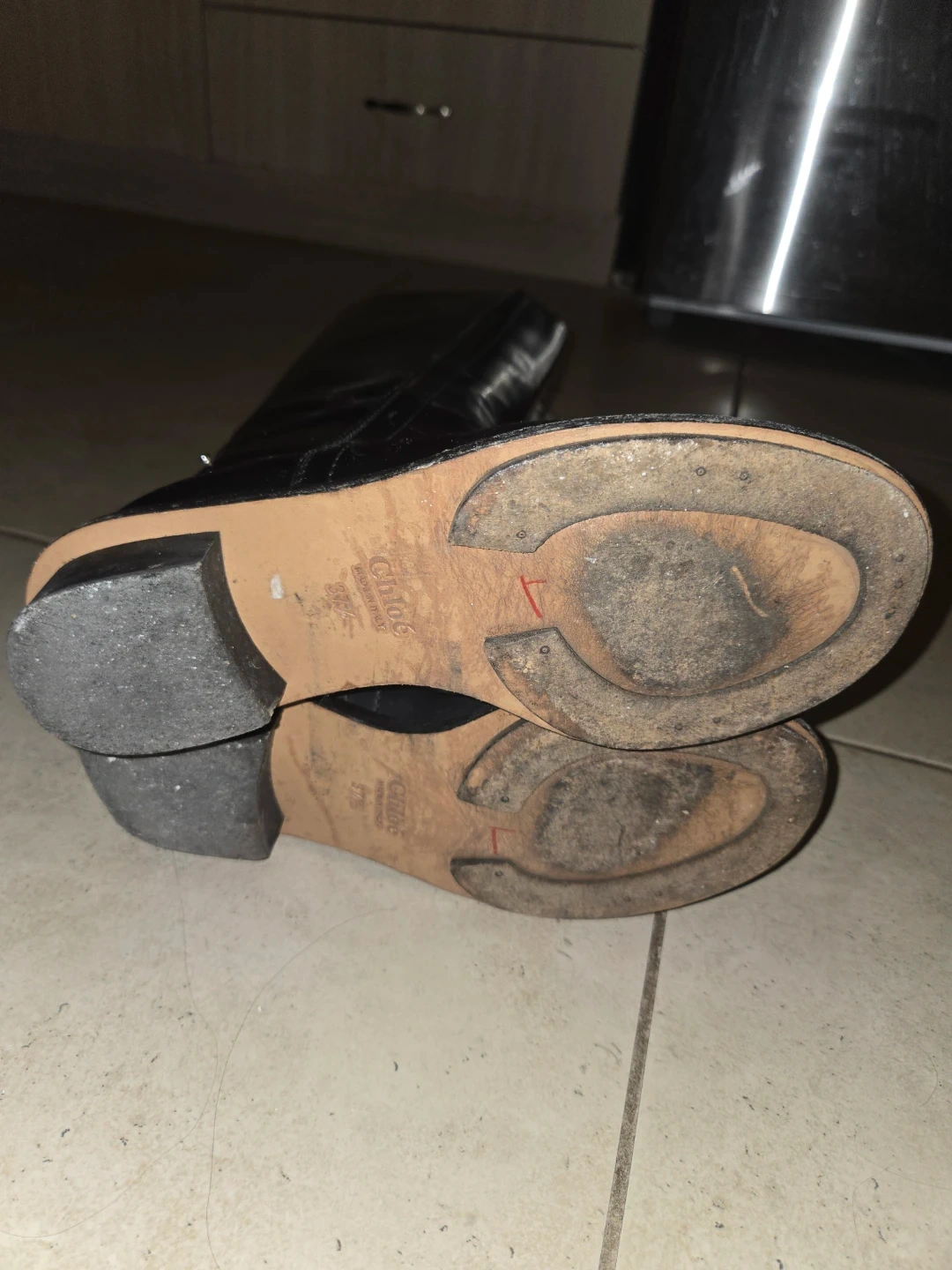 Selling a pair of Chloe black leather riding boots. Amazing Made in Italy quality. Reinforced "horseshoe" leather soles (see pics). They show some signs of wear, but still have lots of life left! They have a zipper in the back and are a classic style. Size 37.5 Will trade for similar quality 35.5-36.
