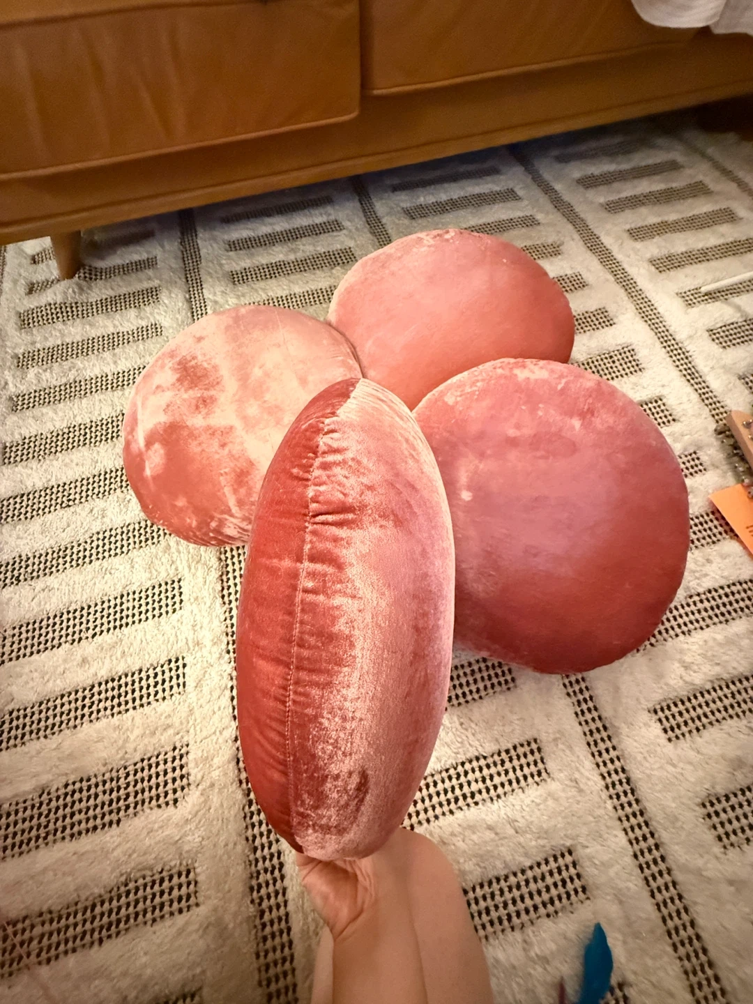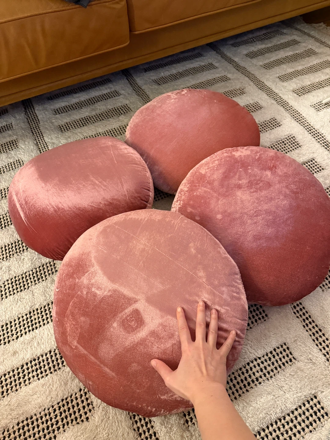 Selling a set of round velvet floor cushions in a lovely pink color. They are in good condition and would add a cozy touch to any room. Perfect for extra seating or just lounging around