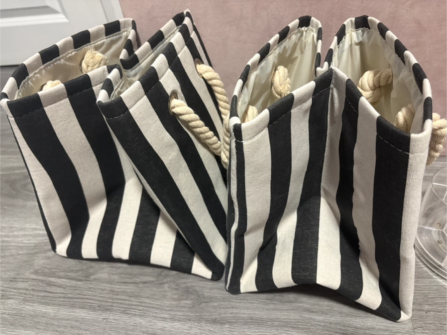 Selling a set of two striped storage bins. They're in great shape and perfect for organizing your space! The bins feature a stylish black and white striped pattern with rope handles, adding a touch of nautical charm to any room