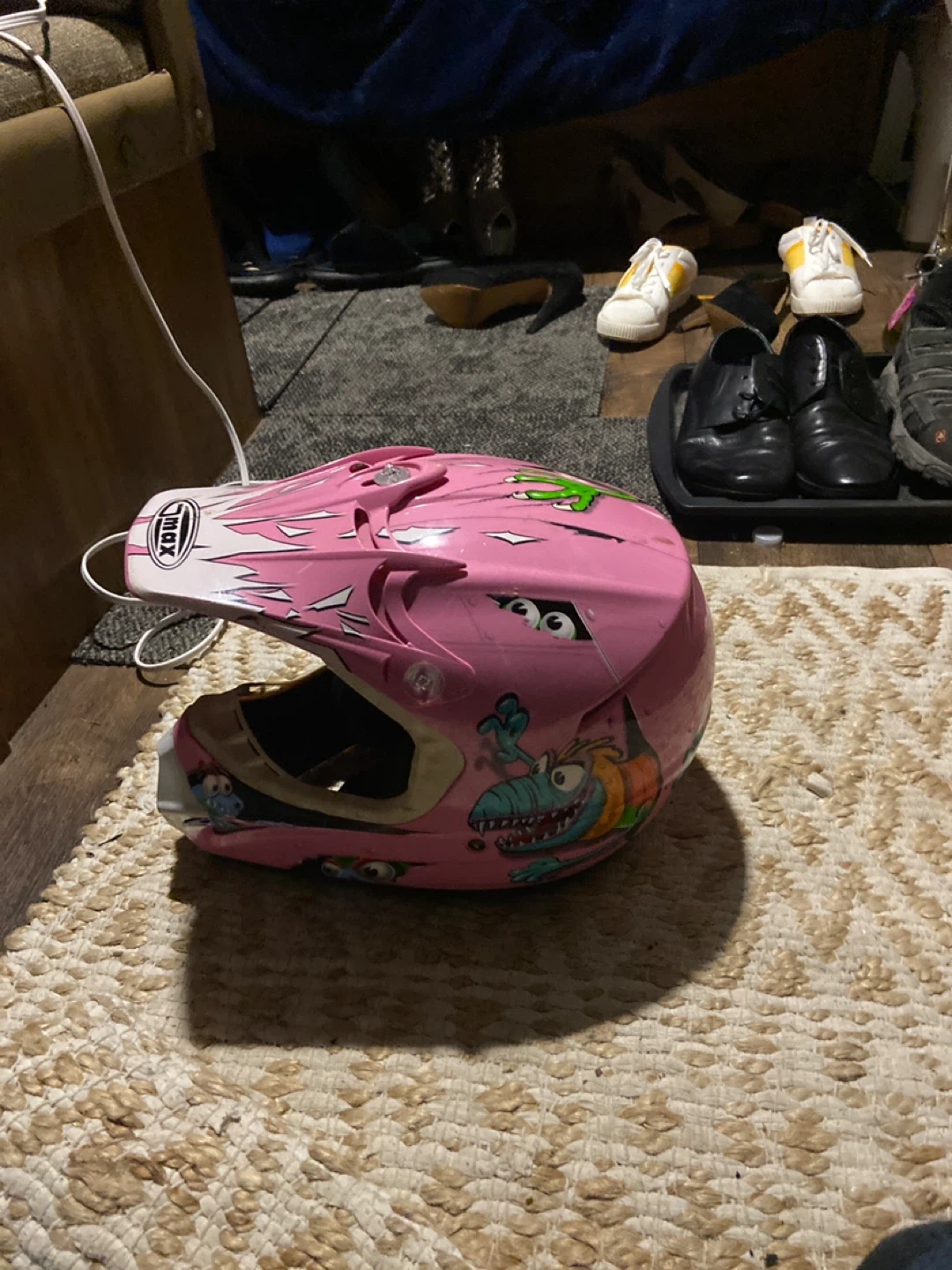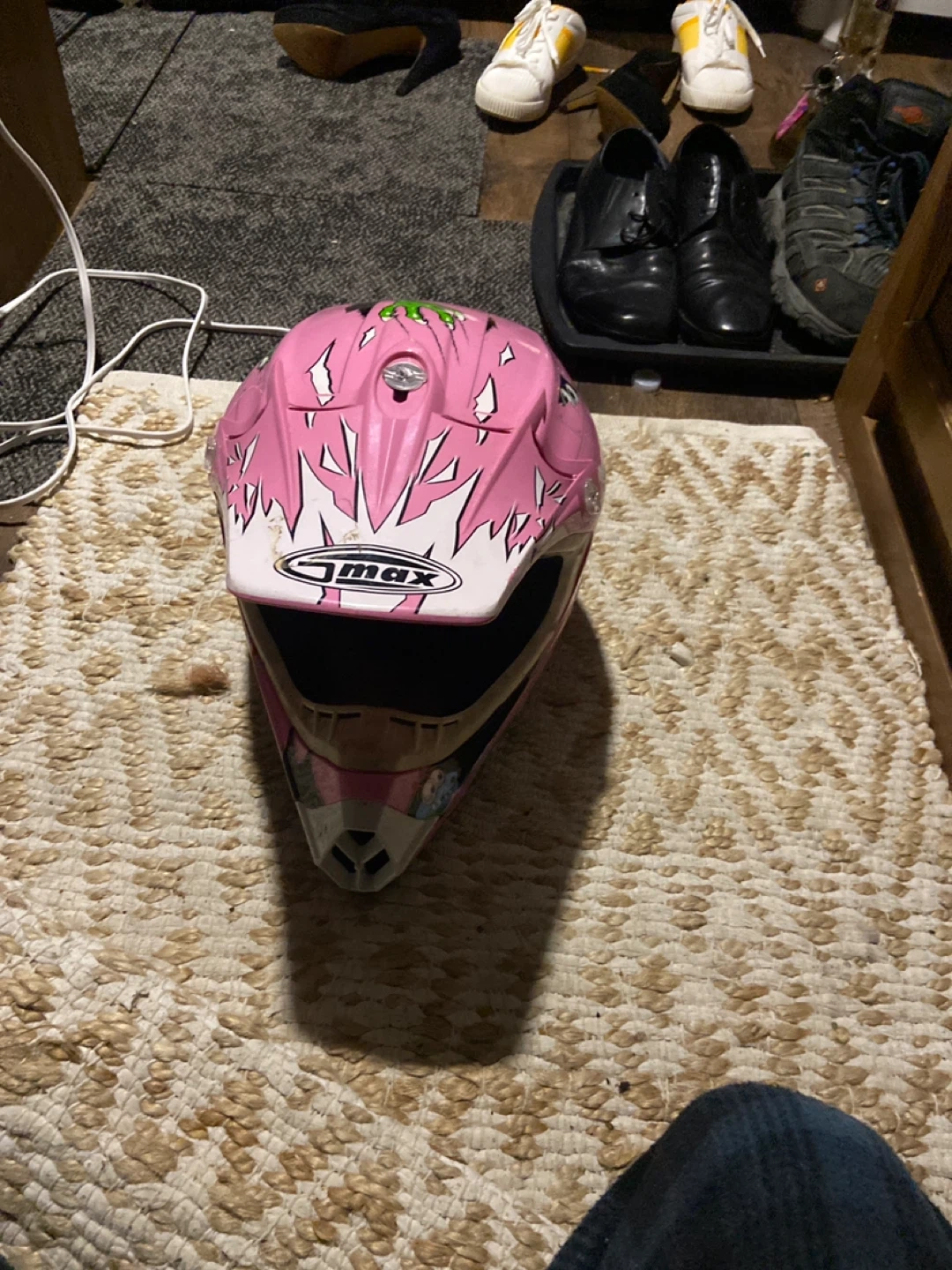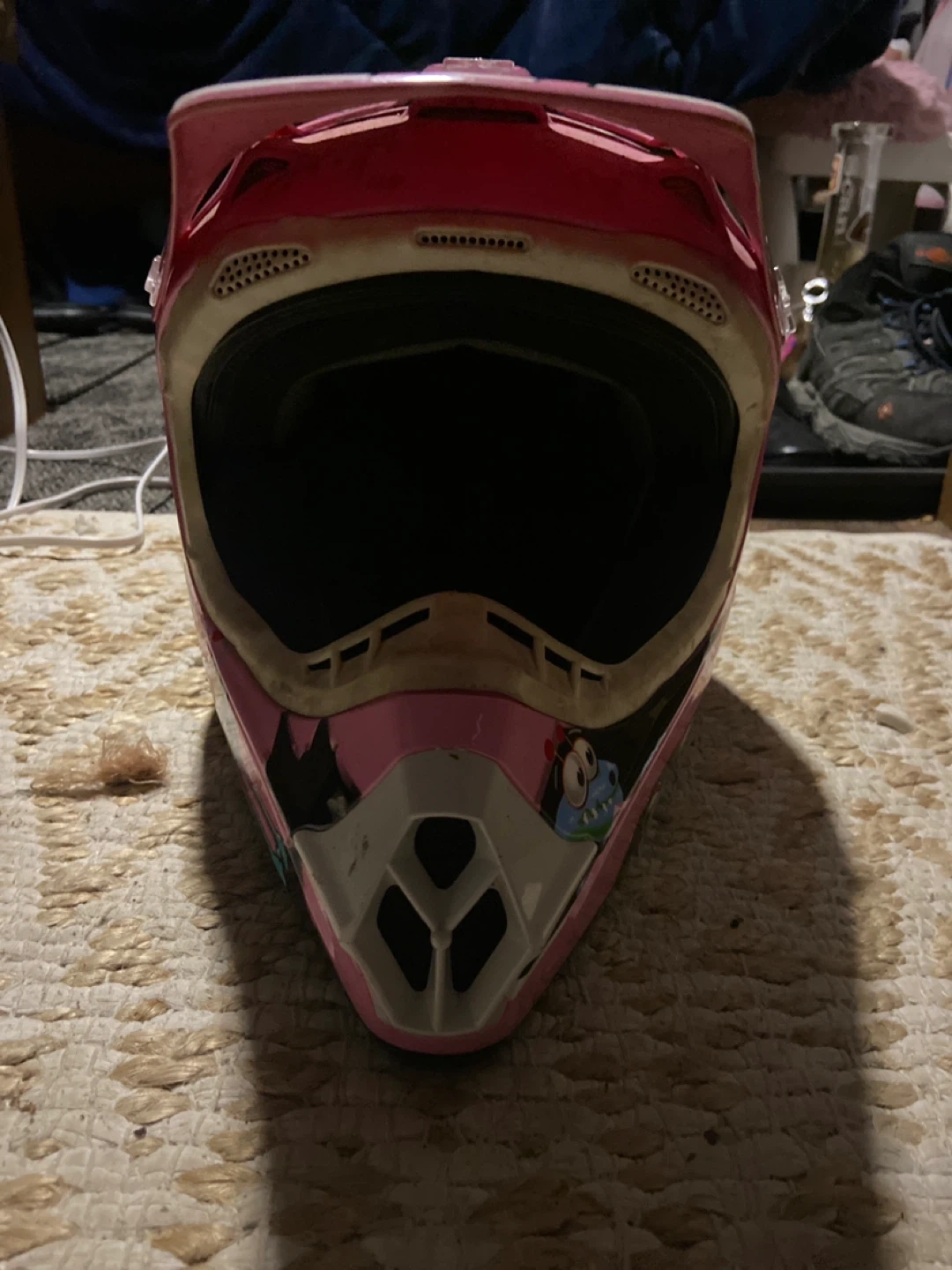 Selling a GMAX motocross helmet in pink! It has some fun cartoon stickers on it. Perfect for hitting the trails or track