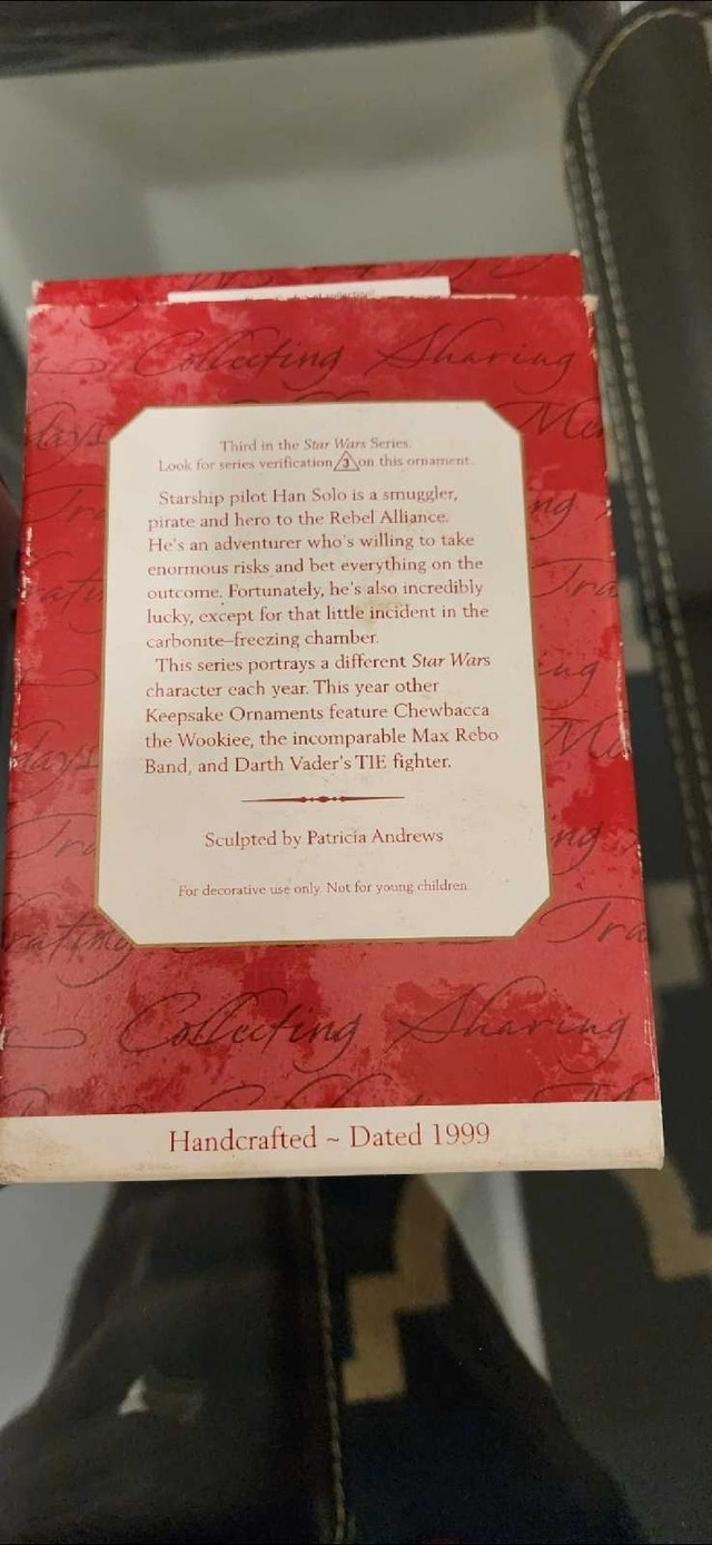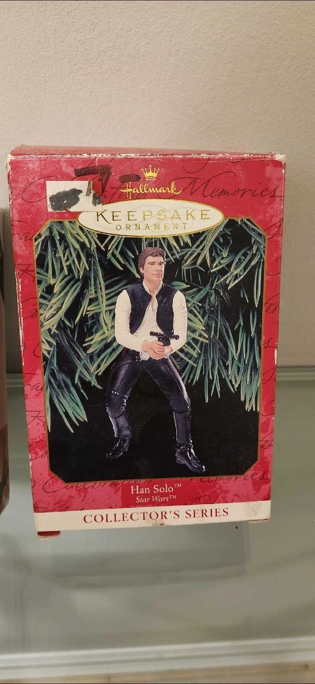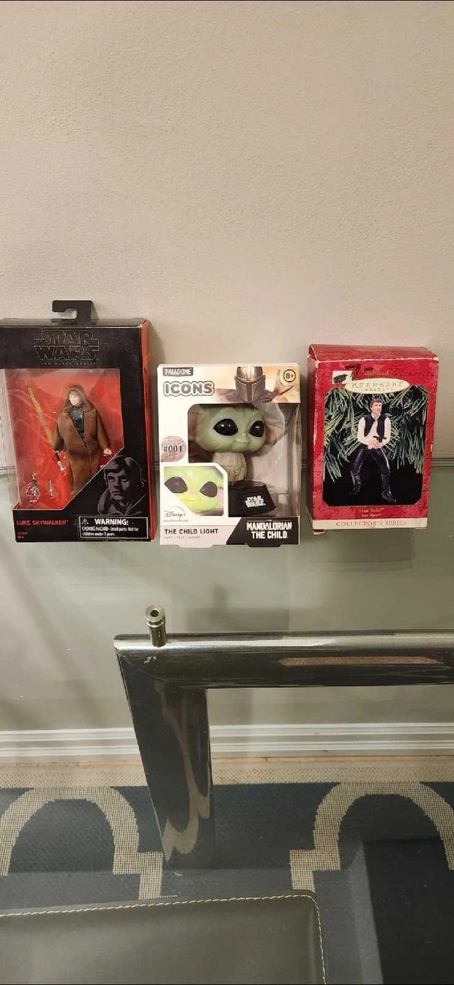 Selling 3 Star Wars items. Asking $45 for all 3. 1 Vintage Hallmark Han Solo Ornament, 1 Luke Skywalker Black Series 2015 Walmart Exclusive, 1 Grogu "The Child" light #001