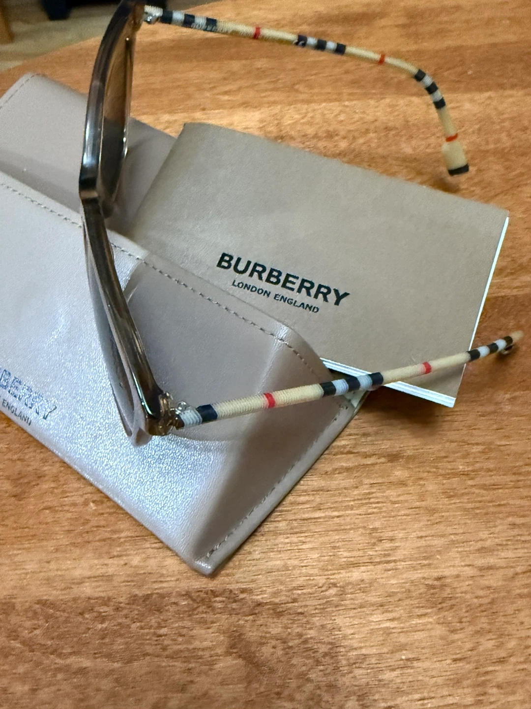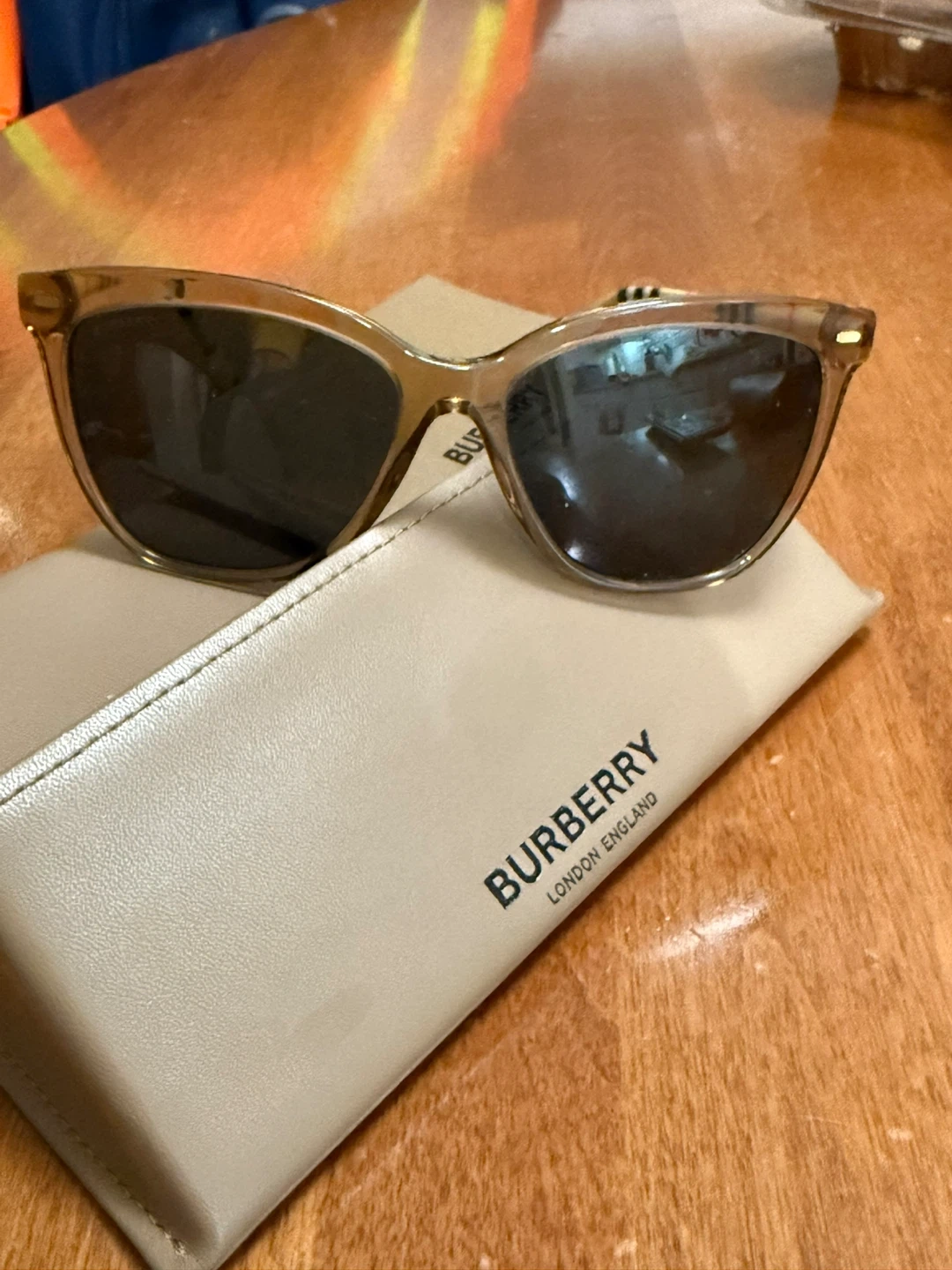 Selling a pair of Burberry sunglasses! They come with their original case. The frames are a light brown colour, and the arms have a unique striped design. Stylish and in great condition!