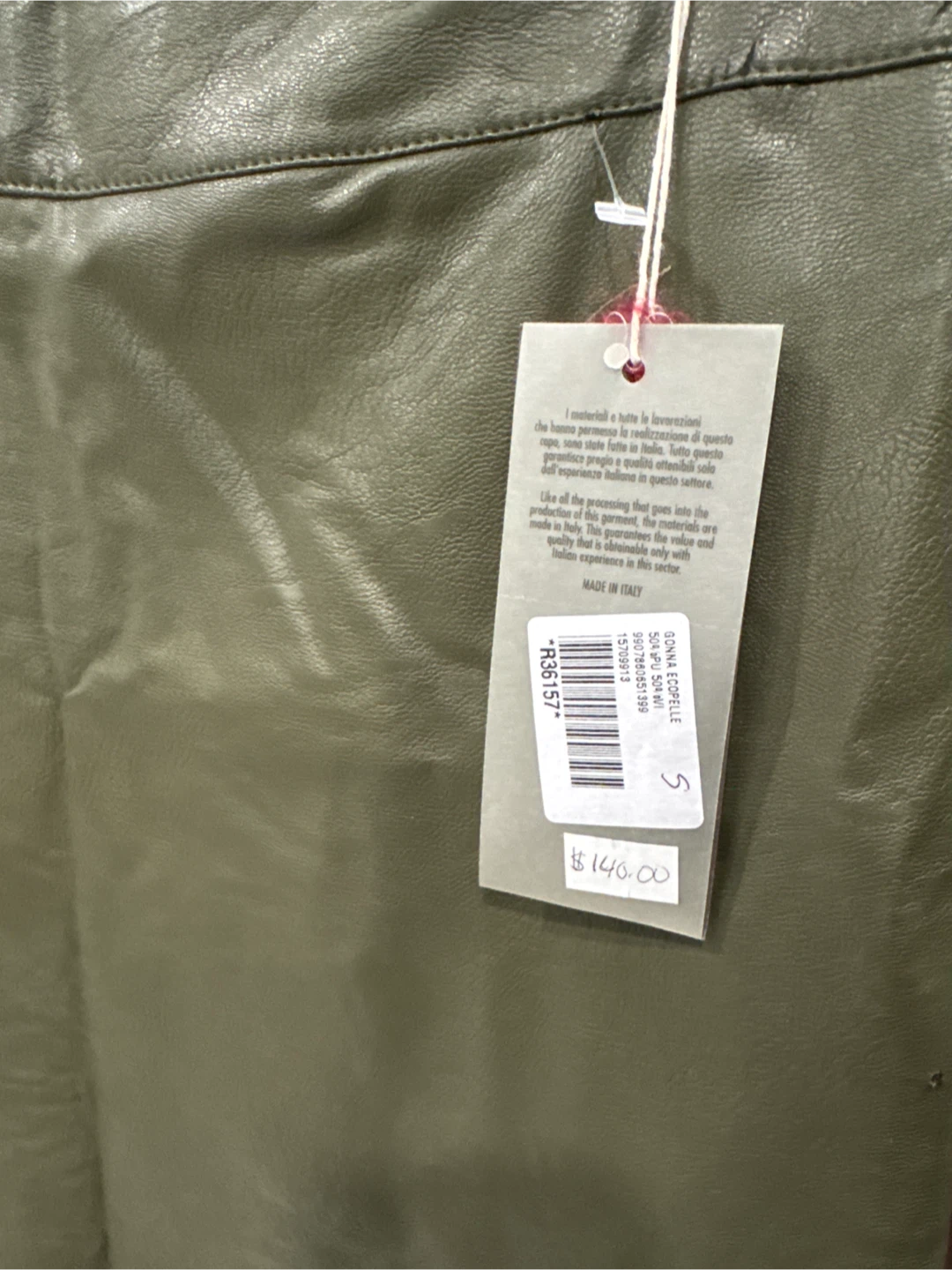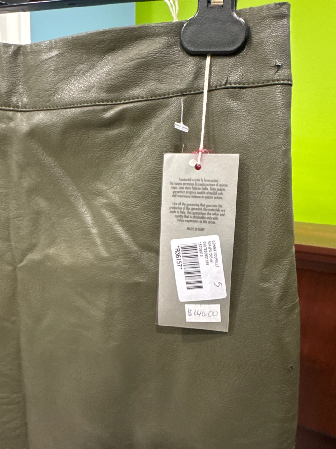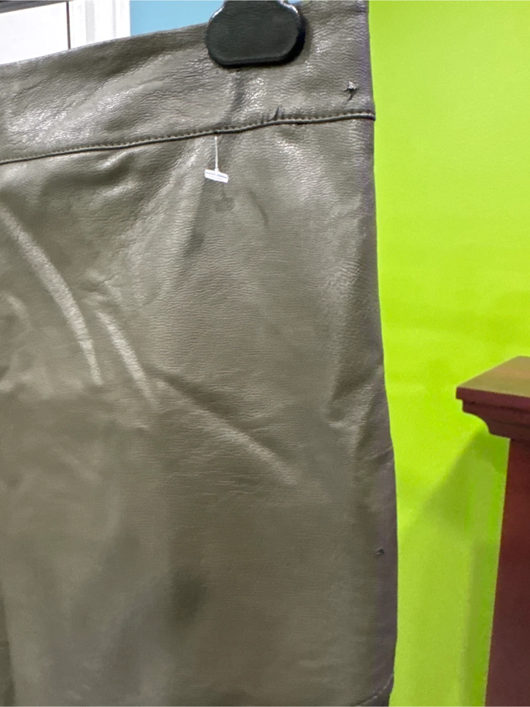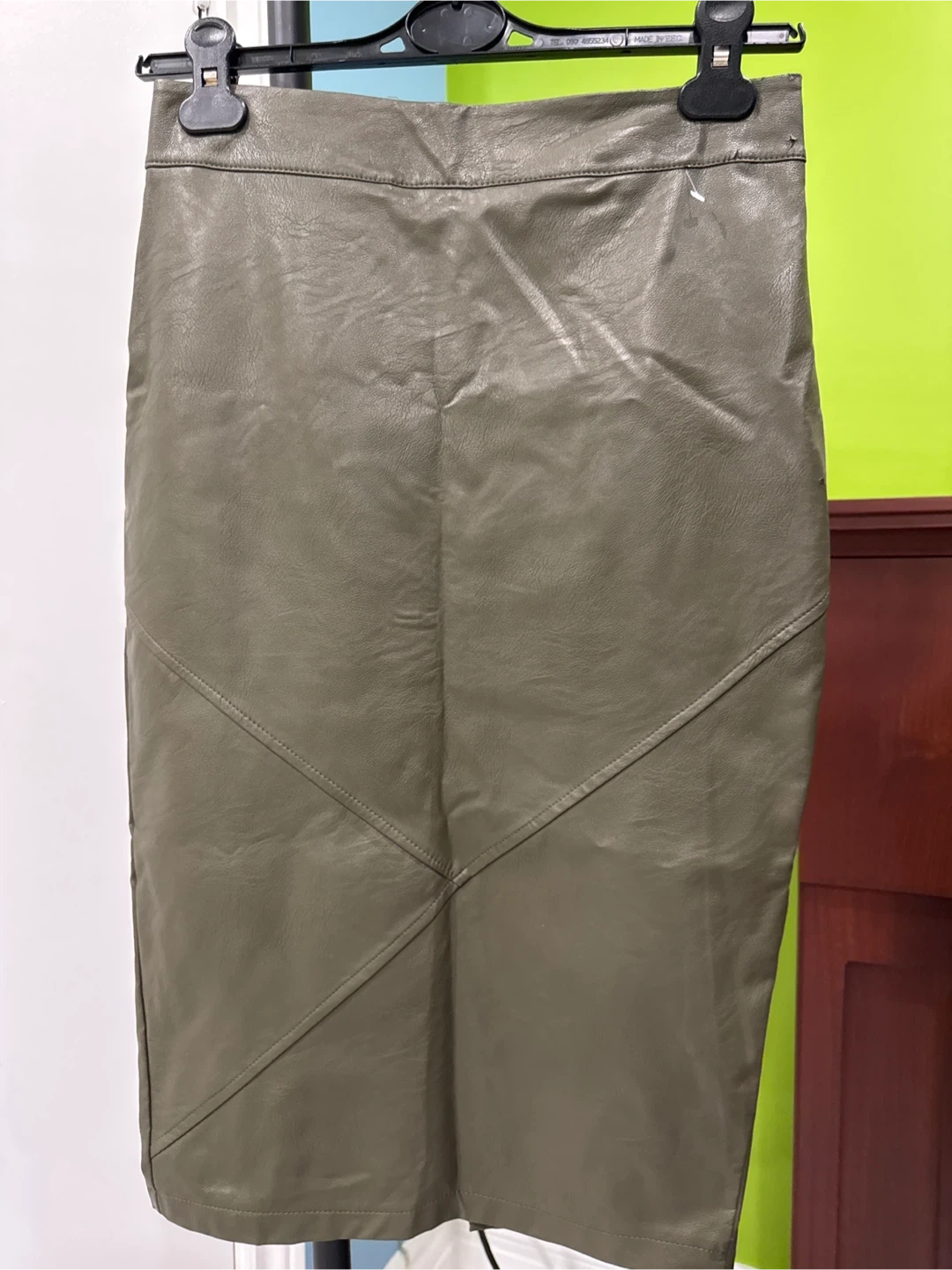 Selling a stylish olive green faux leather pencil skirt. It's in great condition and perfect for adding a touch of sophistication to your wardrobe. The material is soft and comfortable, making it ideal for both work and casual outings. The pencil skirt design is flattering and versatile, easily paired with various tops and shoes. Originally was 140, damaged , see pictures