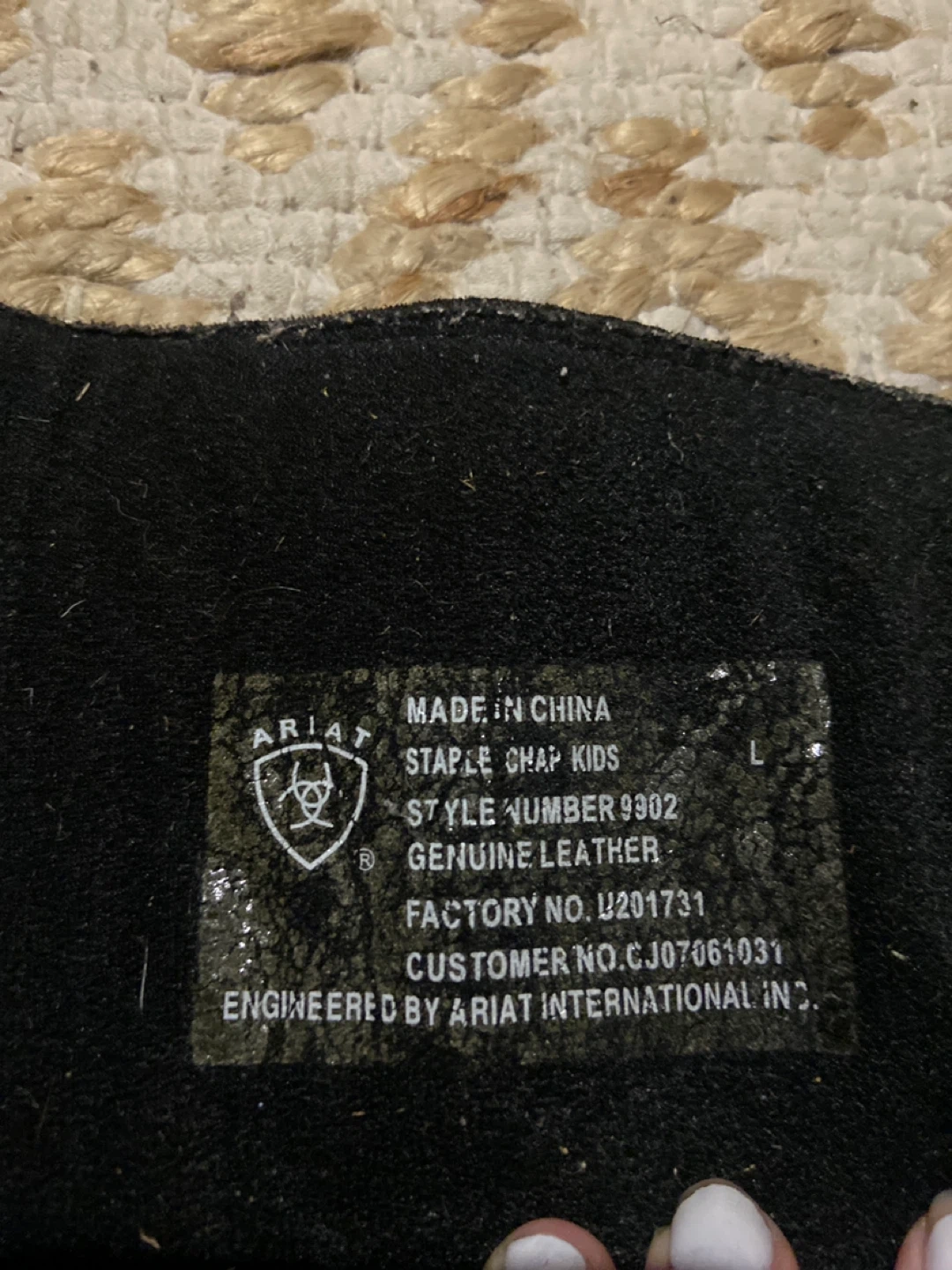 Selling a pair of Ariat Staple Chap Kids in size L! They are made of genuine leather and in good condition. Style number is 9902