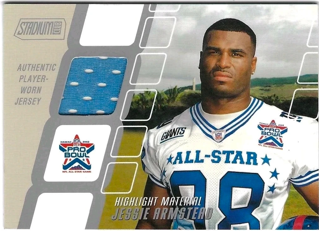 Selling a Stadium Club trading card featuring Jessie Armstead in his Giants All-Star jersey! It's a cool collectible with a piece of authentic player-worn jersey. A great addition for any football fan or card collector