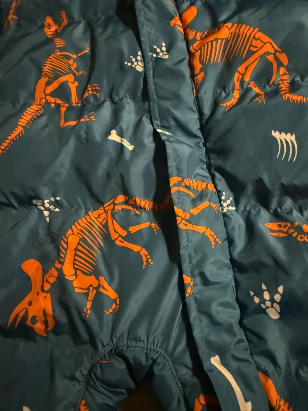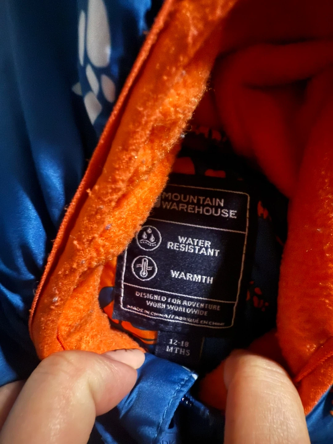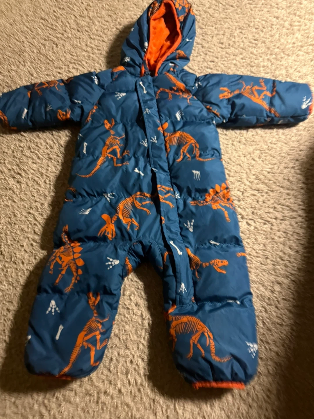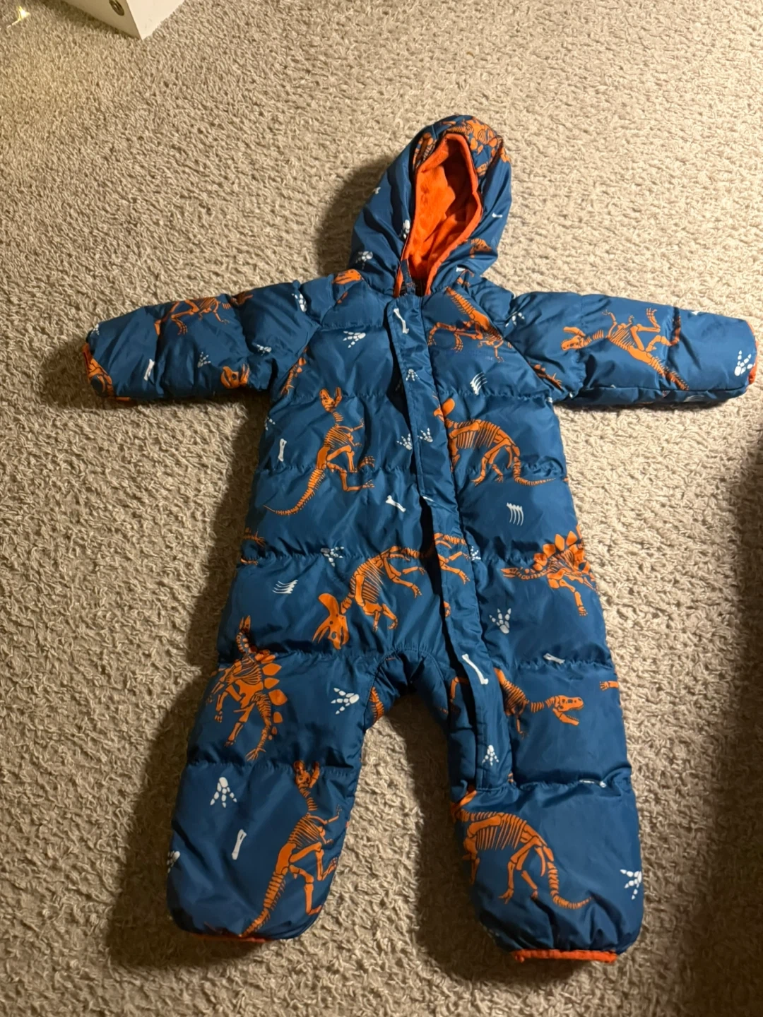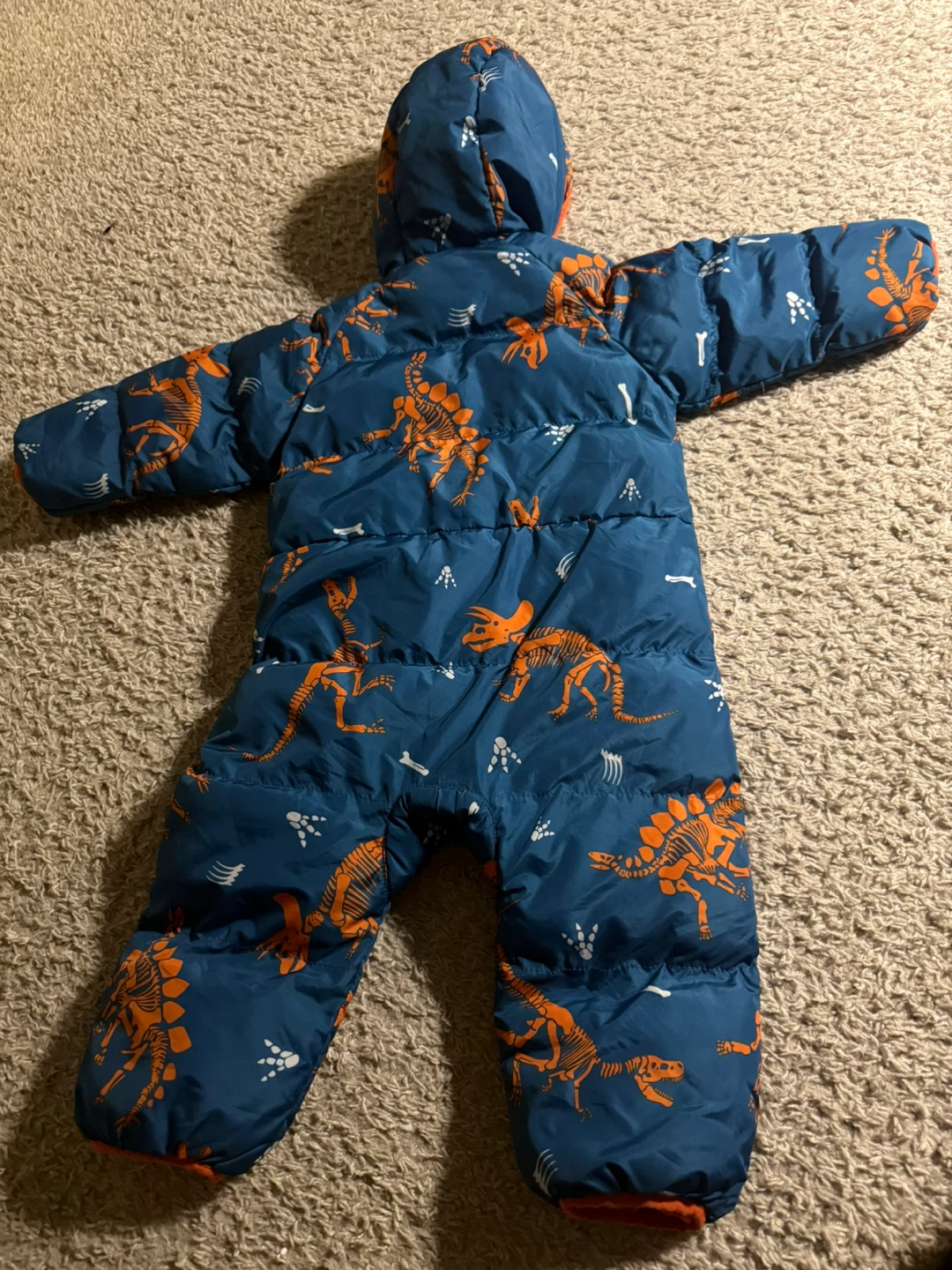 Keep your little one warm this winter with this Mountain Warehouse snowsuit! It's in great condition and features a fun dinosaur pattern. The size is 12-18 months. It's designed to be water-resistant and keep your little one warm during outdoor adventures