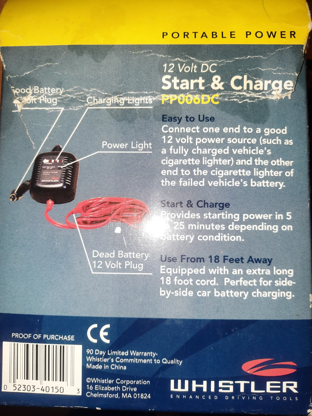 Selling a Brand New - Whistler 12 Volt DC Start & Charge PP006DC portable power unit! It's easy to use, just connect one end to a 12 volt power source. It provides starting power in 5-25 minutes depending on battery condition. The cord is 18 feet long. Recharge your battery without opening the vehicle hood.