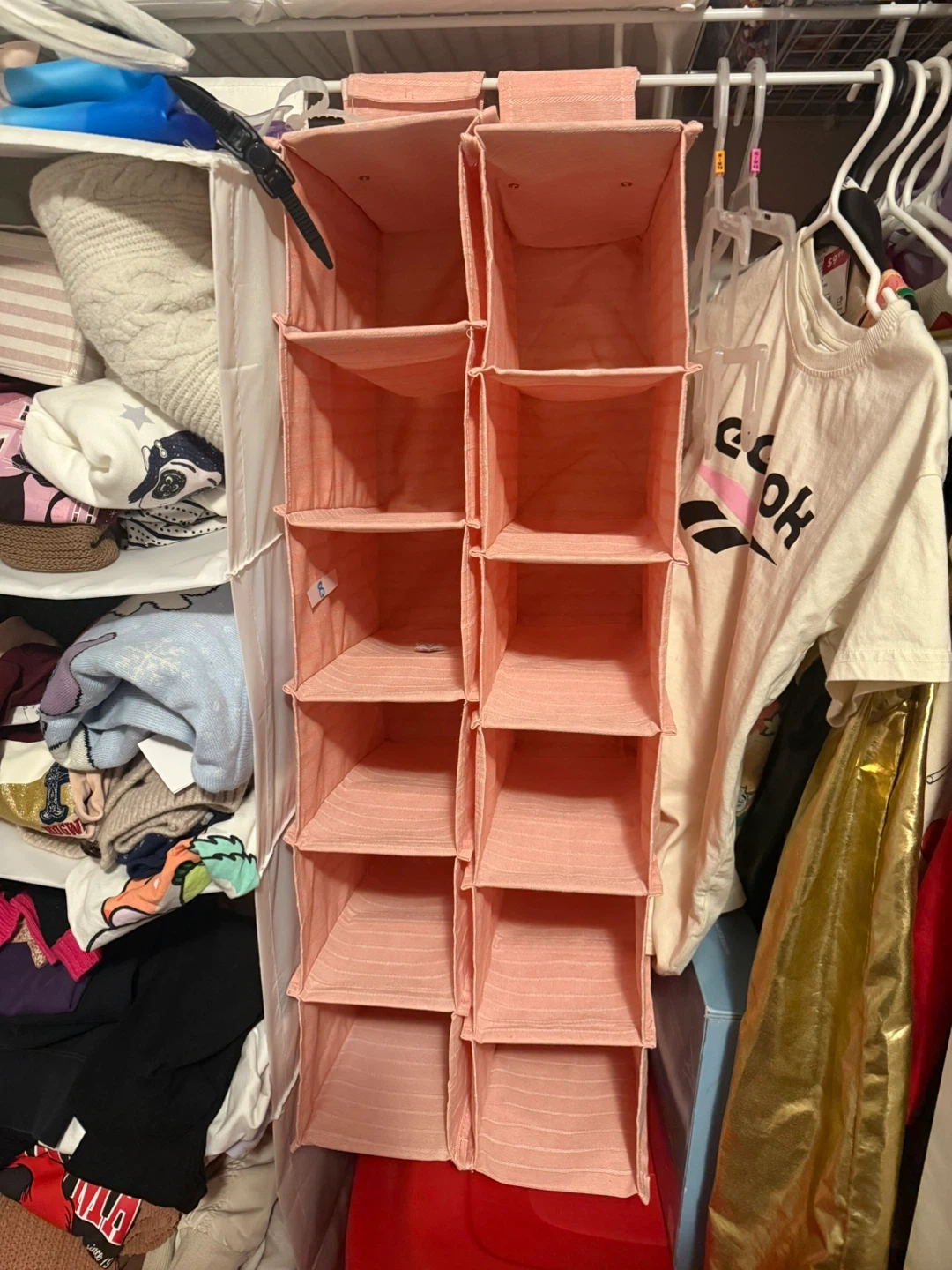 Here's a super handy hanging closet organizer! It's perfect for adding extra storage to your closet, and the pink colour is so cute. Great for keeping clothes, shoes, or accessories neat and tidy