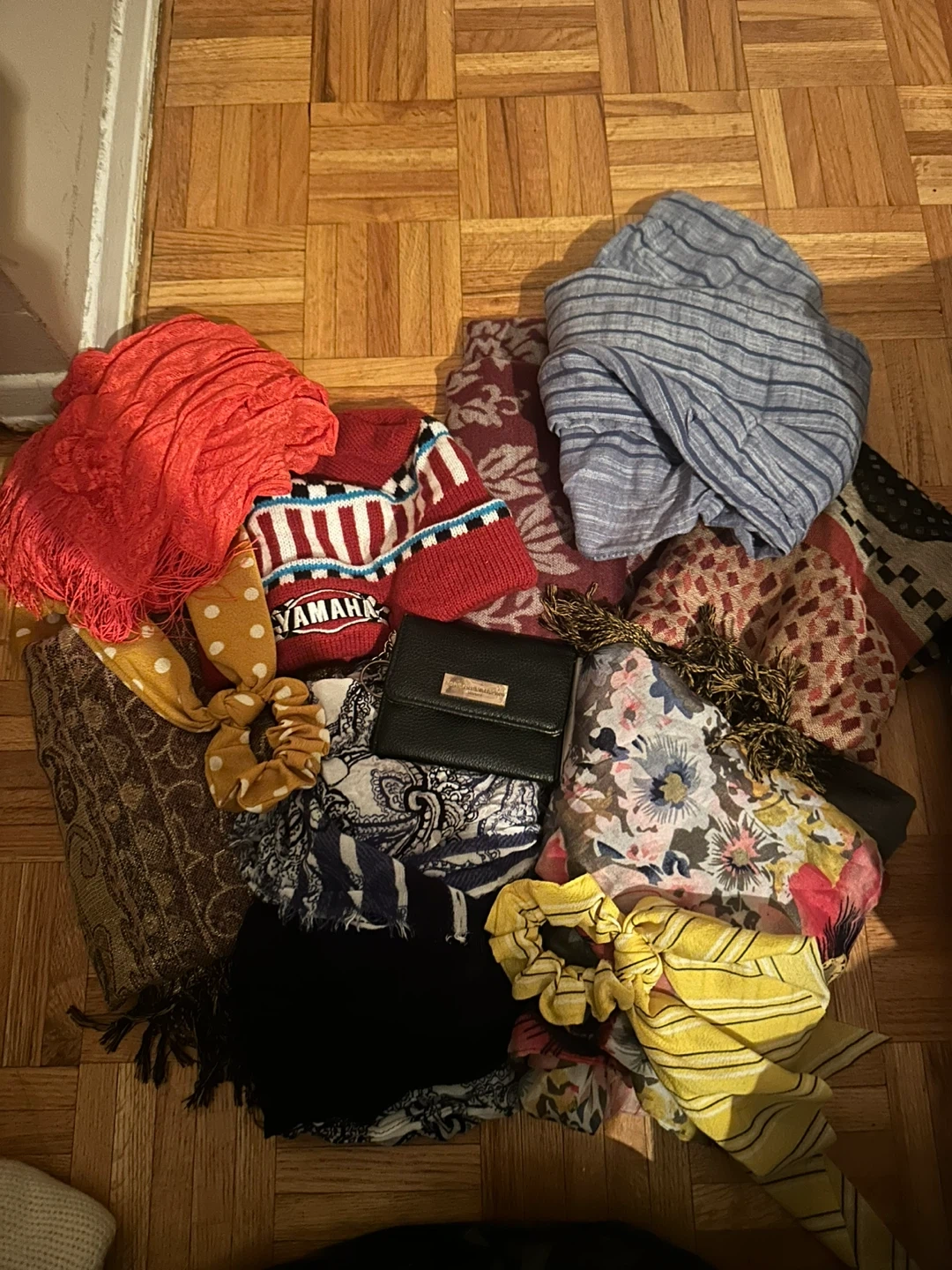 Selling a collection of assorted scarves in various colours and patterns, scrunchies, and a black wallet. These items are in great condition and ready for a new home!