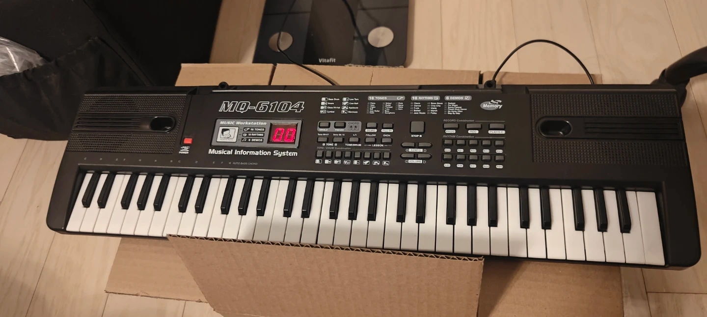 Selling an MQ-6104 electronic keyboard. It comes with a microphone and power adapter. Great for beginners or anyone looking to have some musical fun! Rarely used as upgraded to a bigger one.
