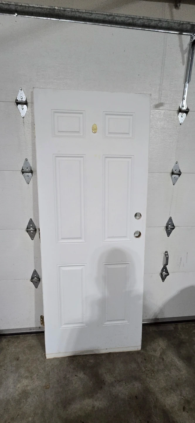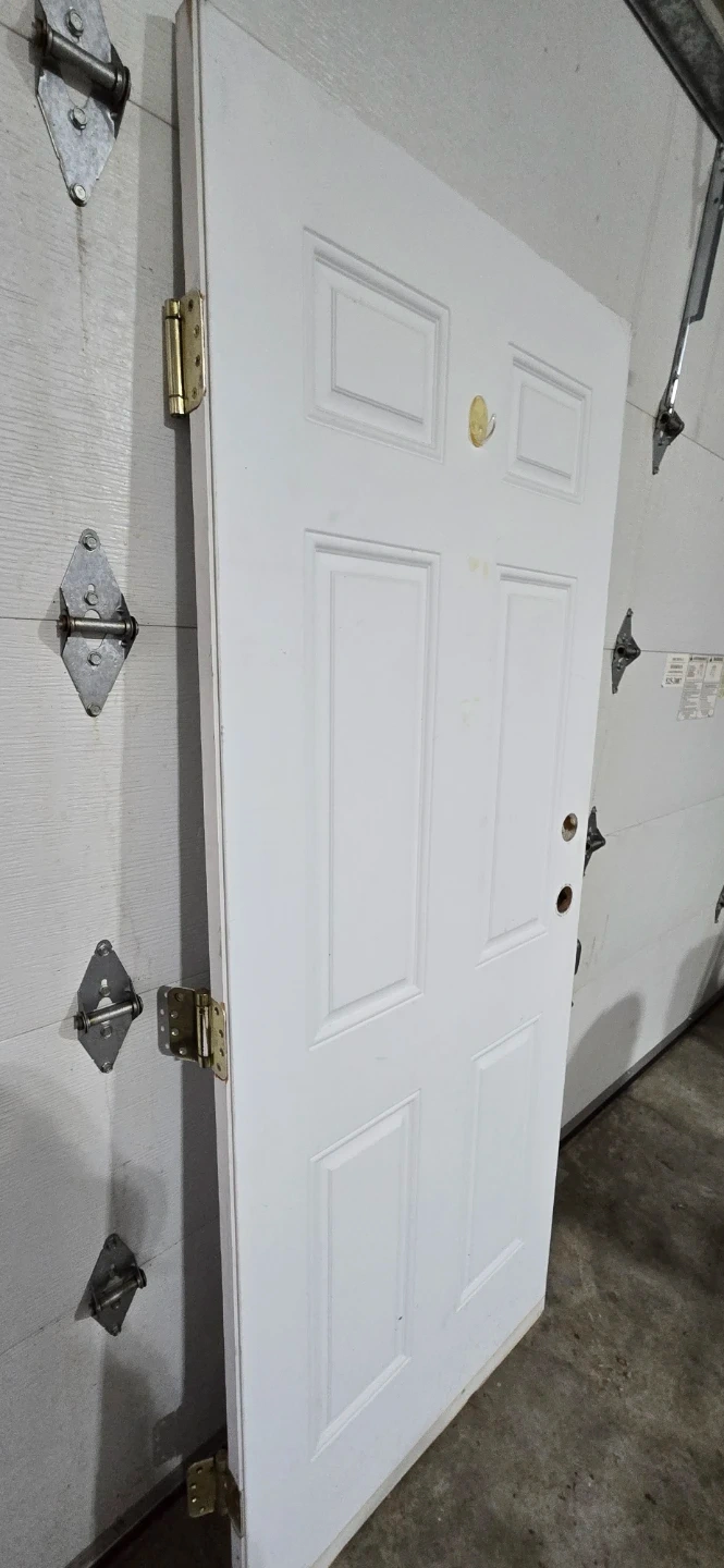Selling a white exterior metal door. It's in good condition and ready to be installed. Perfect for a home renovation project or replacing an old door. It has a classic panel design that will complement any decor