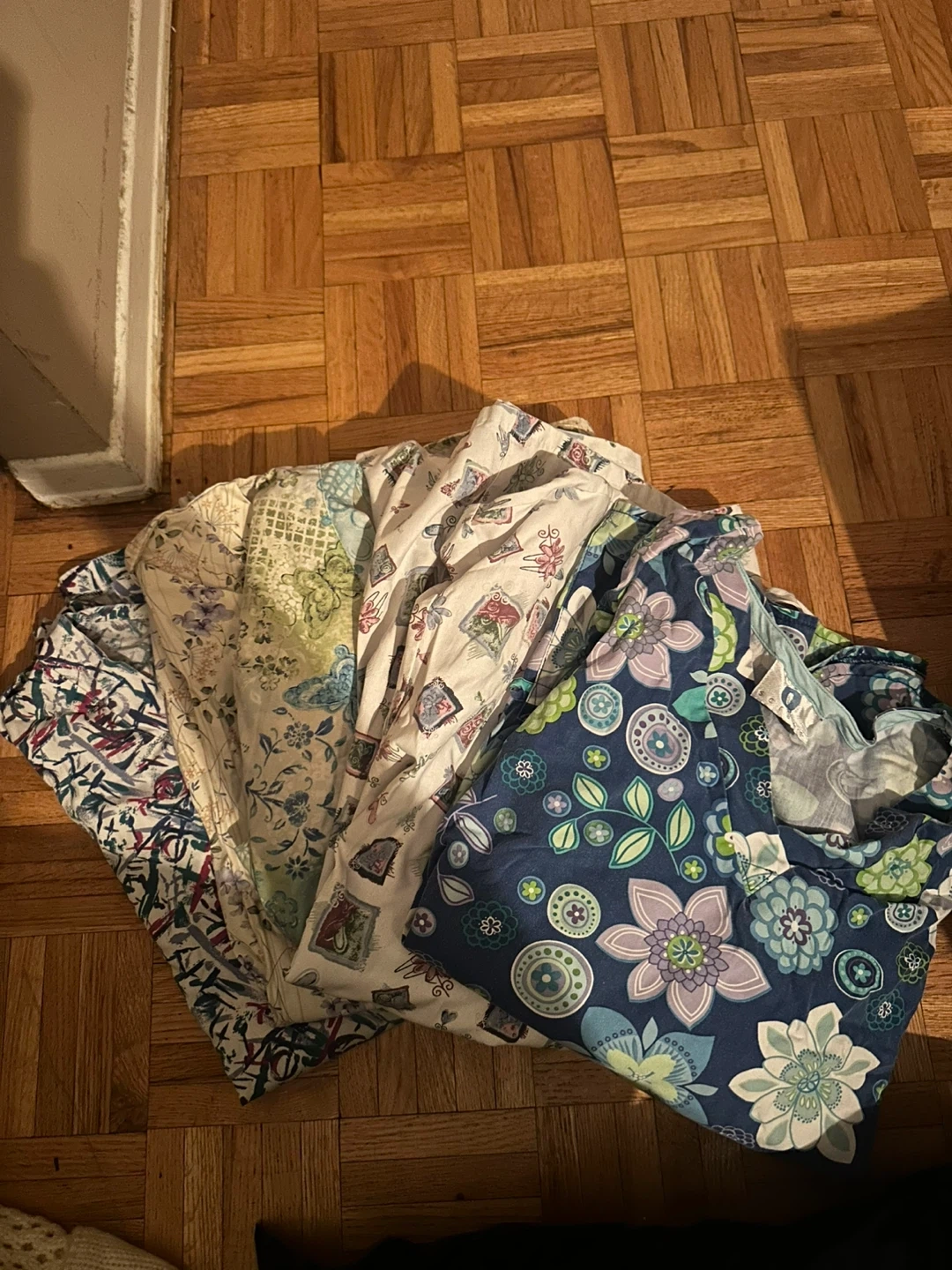Selling a set of scrub tops with various floral and patterned designs. These are great for anyone in the medical field or for casual wear. They're in good condition and ready for a new home!