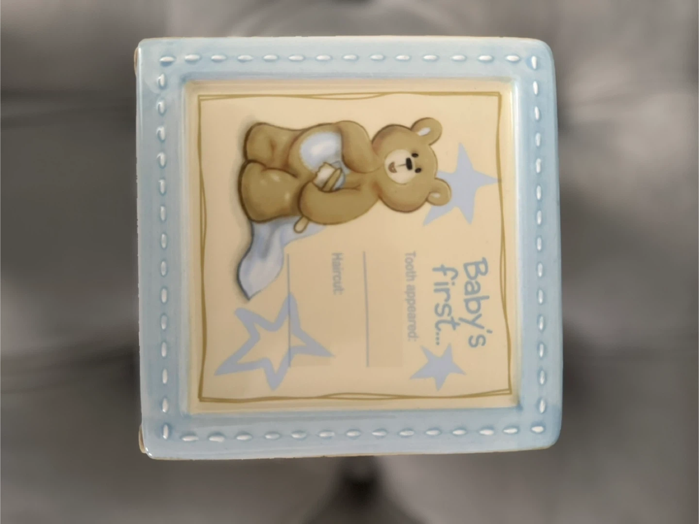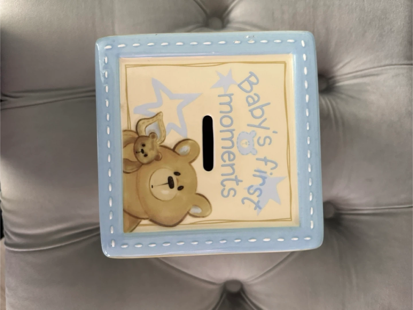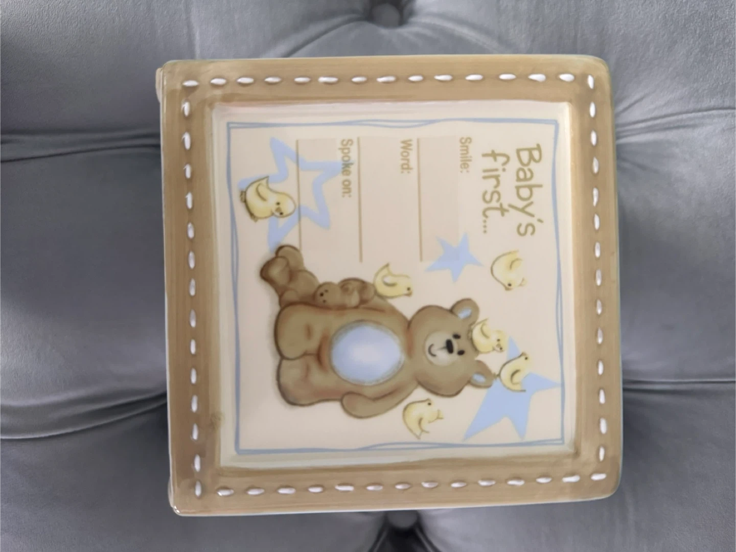 Here's a cute ceramic box for baby's first moments! It features adorable teddy bear designs and spaces to record important milestones like first smile, word, birthday, and more. Perfect for storing precious keepsakes!