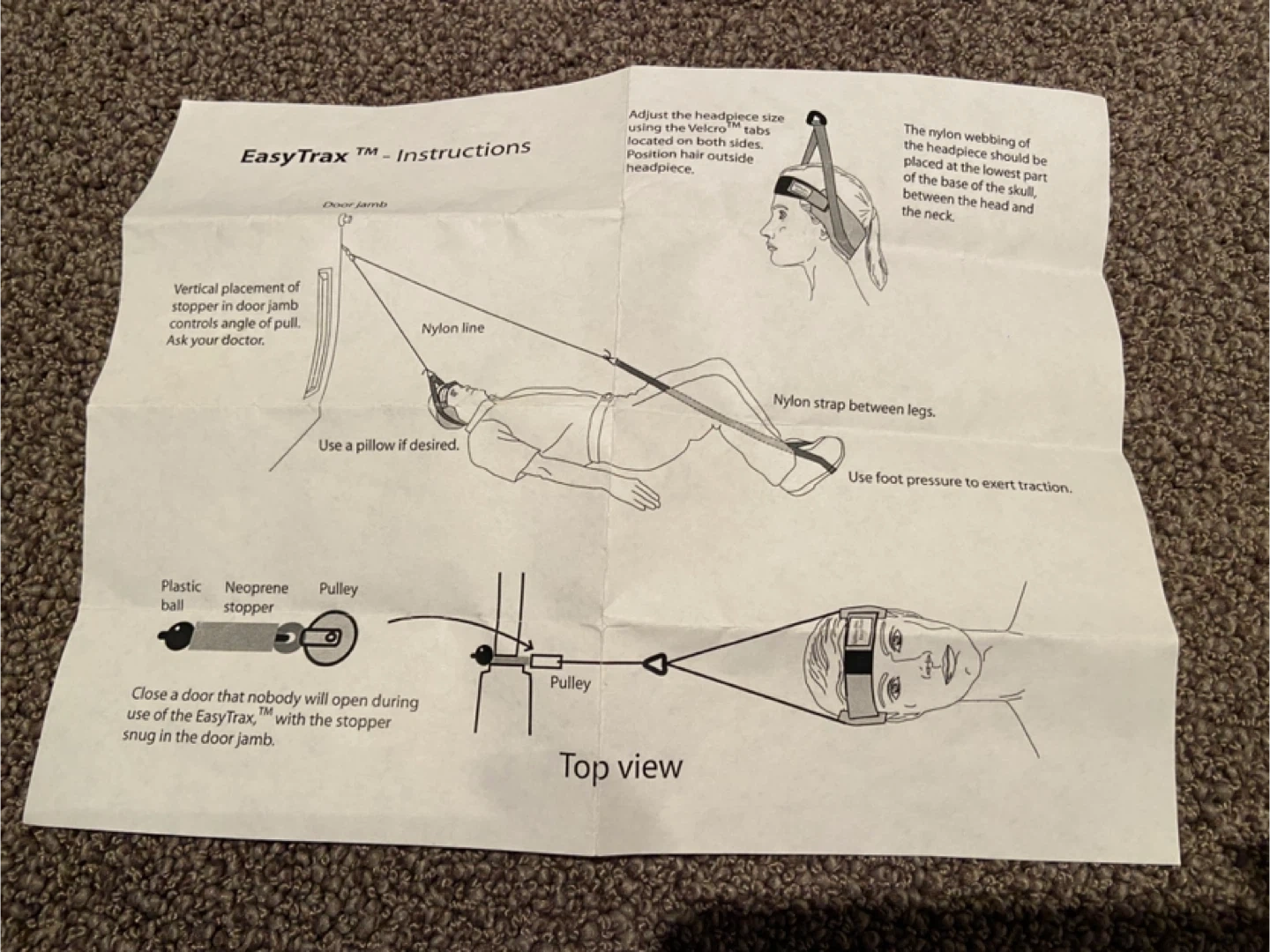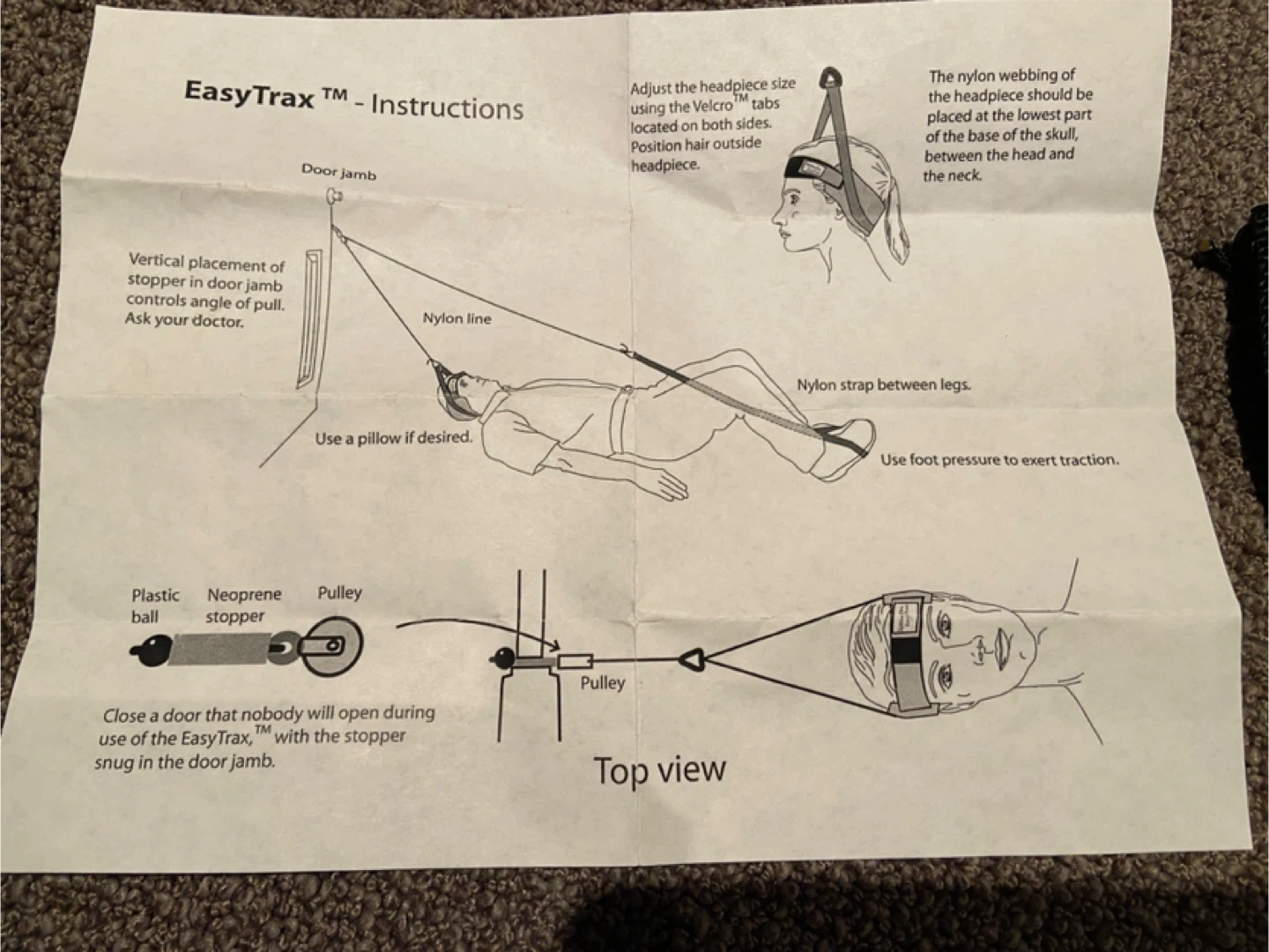 Selling an EasyTrax cervical traction device. This device is designed for home use and helps with neck pain by providing gentle traction. It includes all the necessary components for setting it up on a door. Please refer to the instructions for proper use and setup!