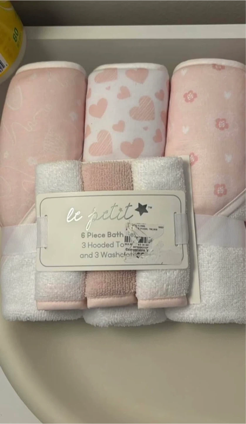Selling a brand new Le Petit 6-piece baby bath set! It includes 3 hooded towels and 3 washcloths. Perfect for your little one's bath time