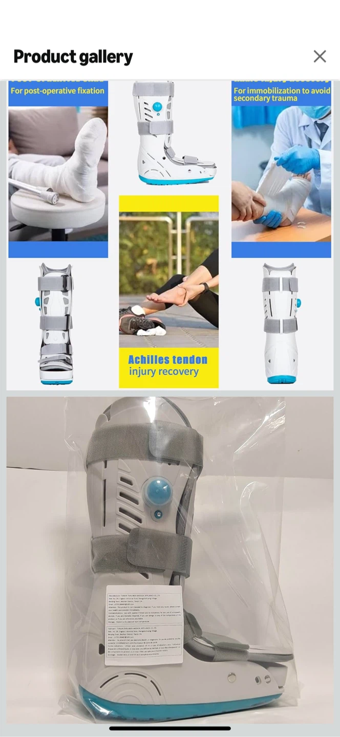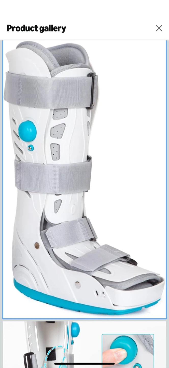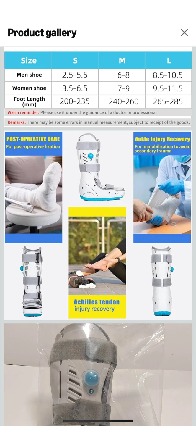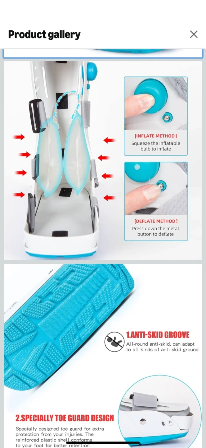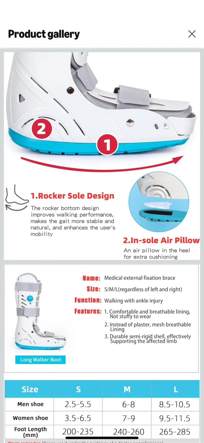 Selling a medical walking boot in size medium. It's designed for walking with an ankle injury and features a comfortable, breathable lining. The rocker sole design improves walking performance, and it has an in-sole air pillow for extra cushioning. It also has an anti-skid groove and a specially designed toe guard for extra protection