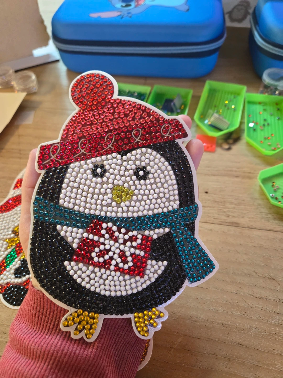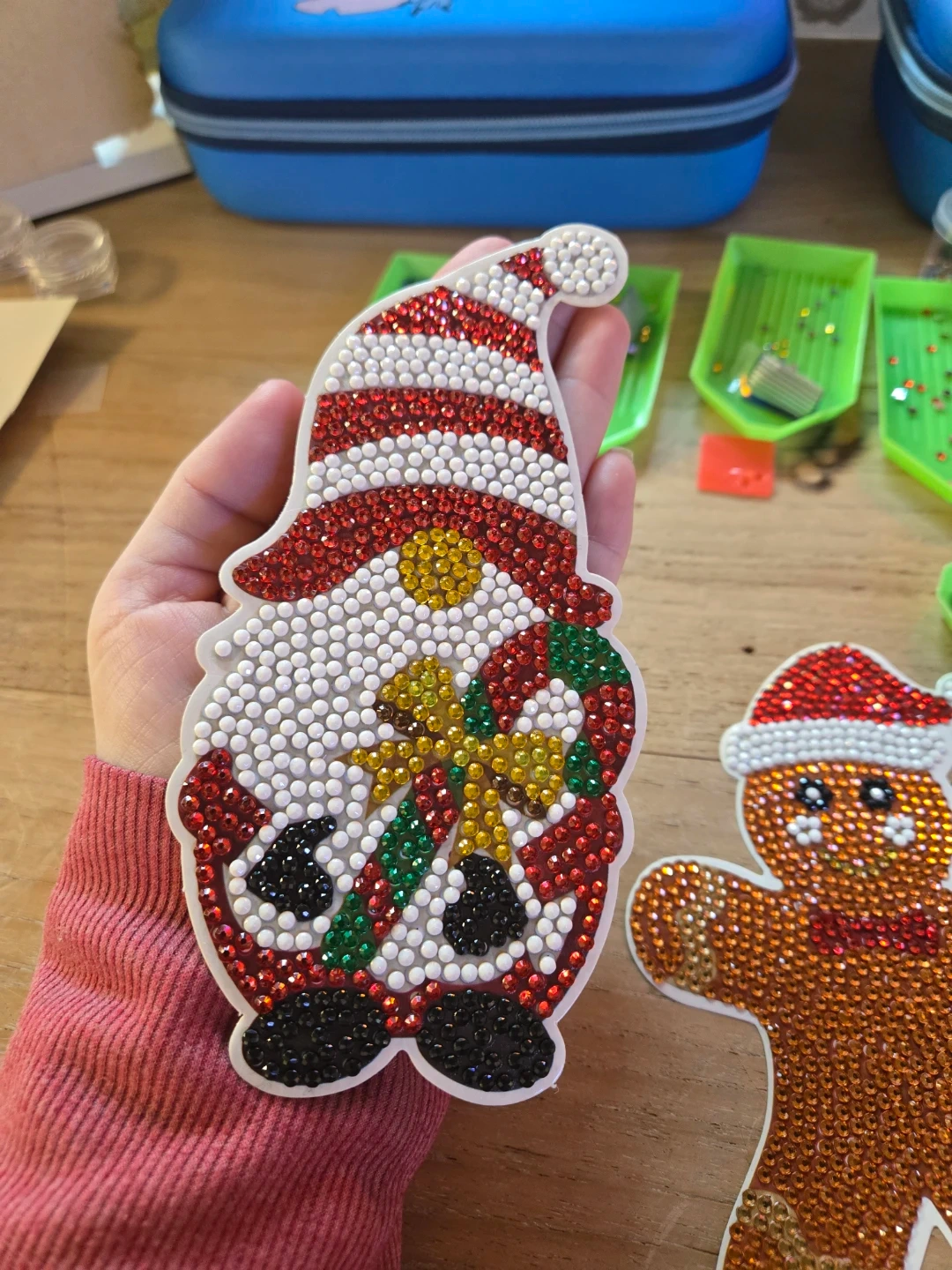 I have a bunch of cute diamond art stickers for sale! They feature a variety of designs, including a gnome, unicorn tumbler, reindeer, penguin, and gingerbread man. These are perfect gifts for loved ones.
