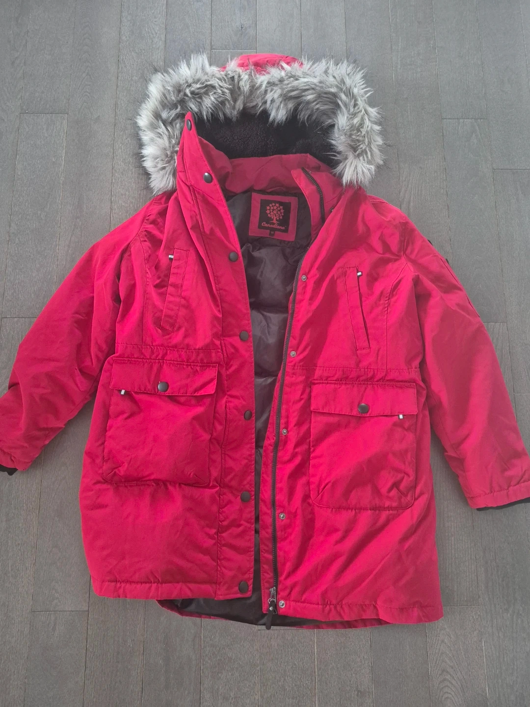 Selling a Canadiana winter parka in a vibrant red colour. It's a size 1X and features a faux fur-trimmed hood to keep you warm during those cold Canadian winters. This jacket is perfect for staying cozy and stylish!