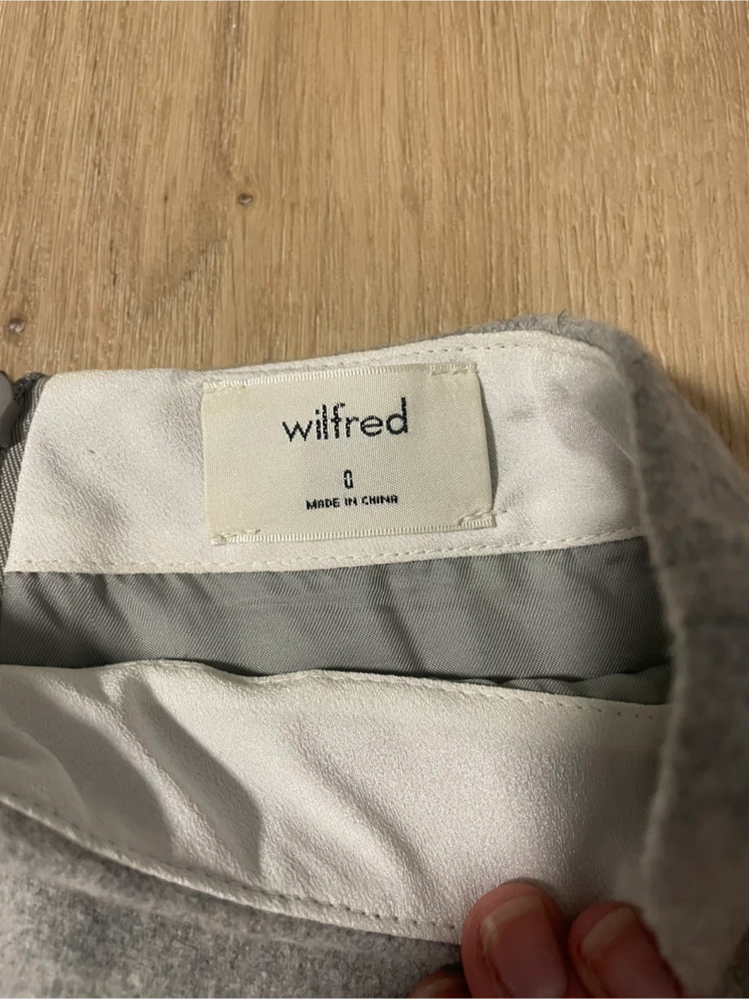 Gray coloured Wilfred mini skirt. Thick material, great for fall/winter with some tights. In excellent condition, I just don’t reach for it much. And it has pockets!