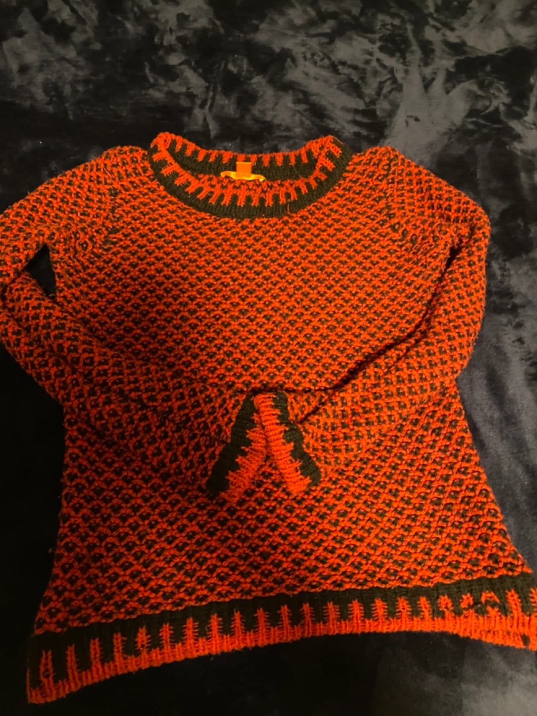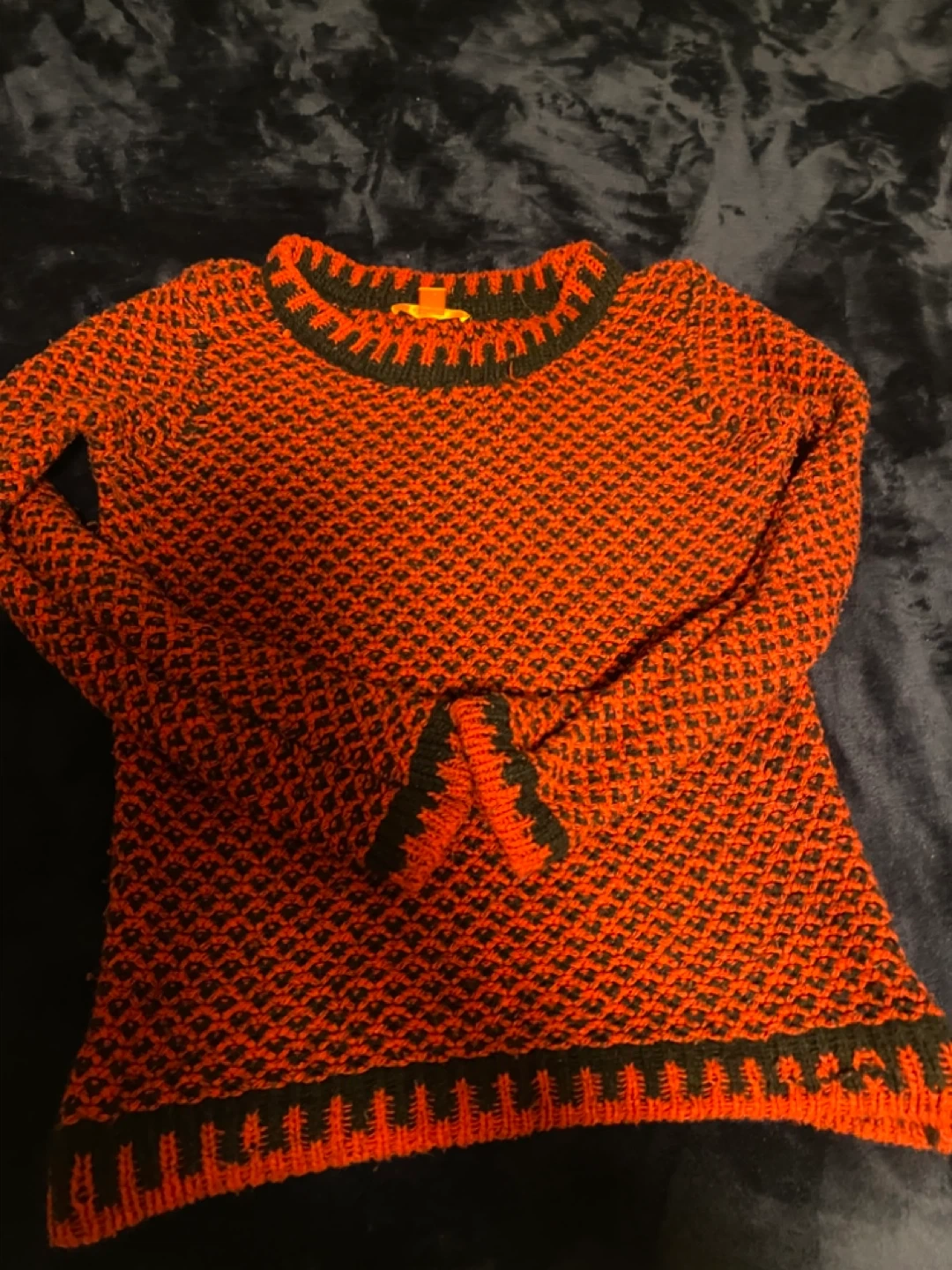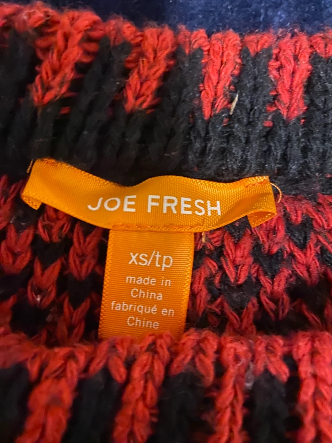 Cozy Joe Fresh sweater in a vibrant red and black pattern! It's an XS size, perfect for layering or wearing on its own. The material is soft and warm, great for cooler weather