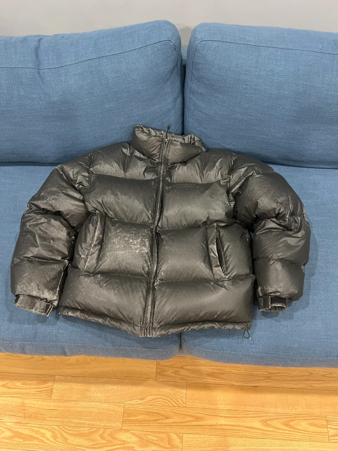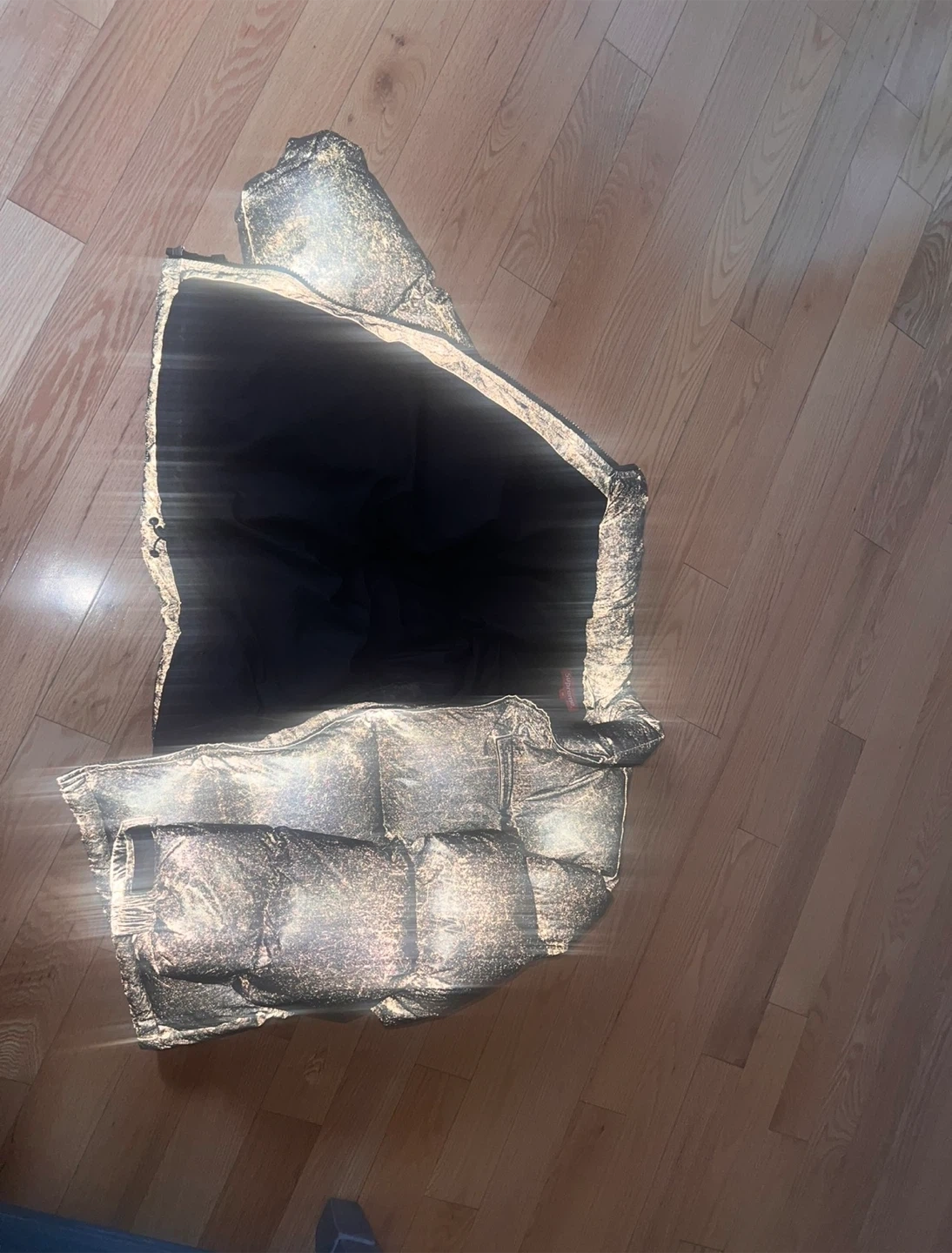 this is a supreme puffer jacket good for winter and style,it keeps you warm during cold weather.its not dirty nore damaged it just the reflection design.