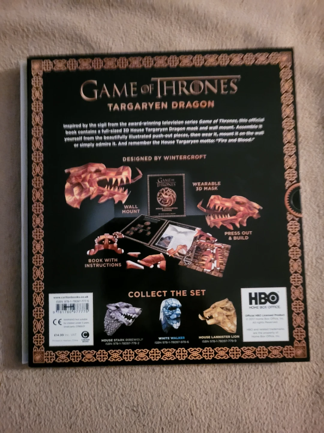 Build your own House Targaryen Dragon 3D mask and wall mount! Inspired by the sigil from the award-winning television series Game of Thrones, this official book contains a full-sized 3D House Targaryen Dragon mask and a mount. Assemble it yourself from the beautifully illustrated pieces, then either wear it, mount it on the wall, or simply admire it