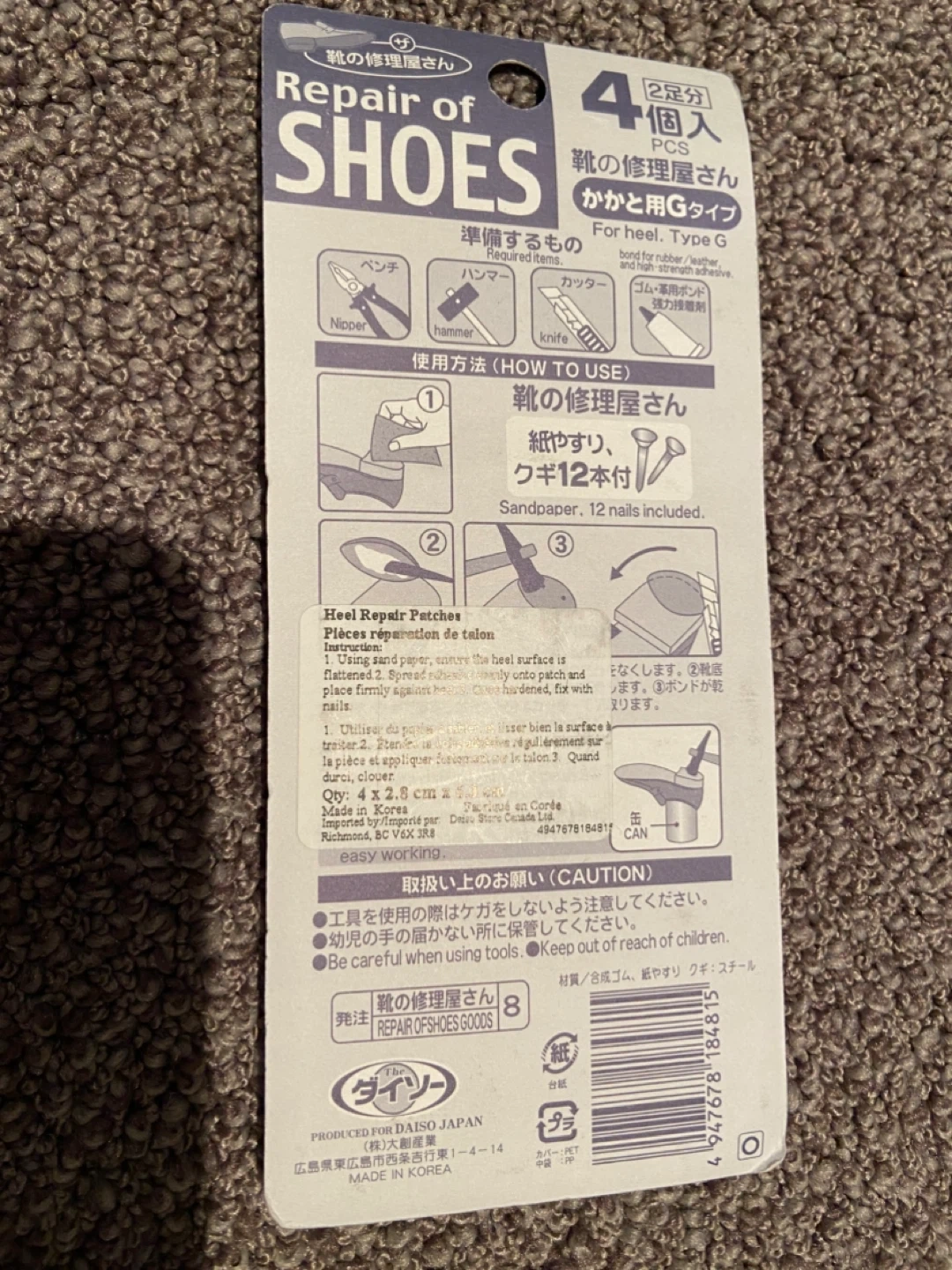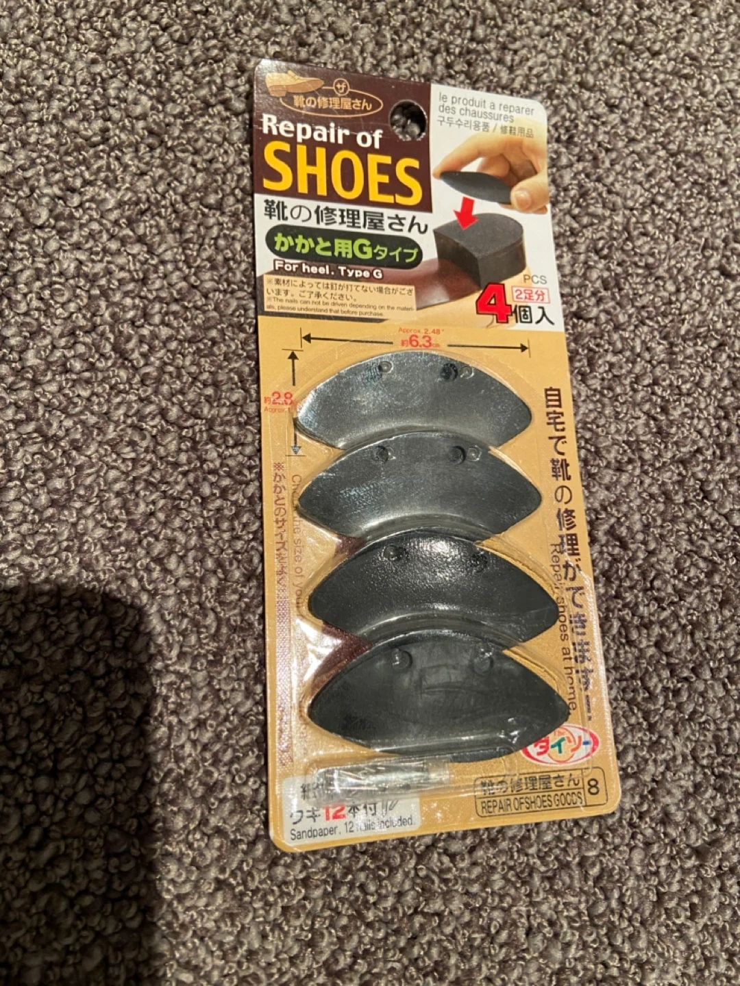 I'm selling a Daiso shoe repair kit, perfect for fixing up your heels! It's the 'Type G' kit, and it comes with 4 pieces, plus sandpaper and 12 nails included. Easy to use and great for a quick fix!