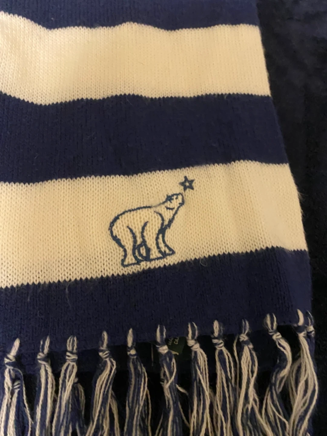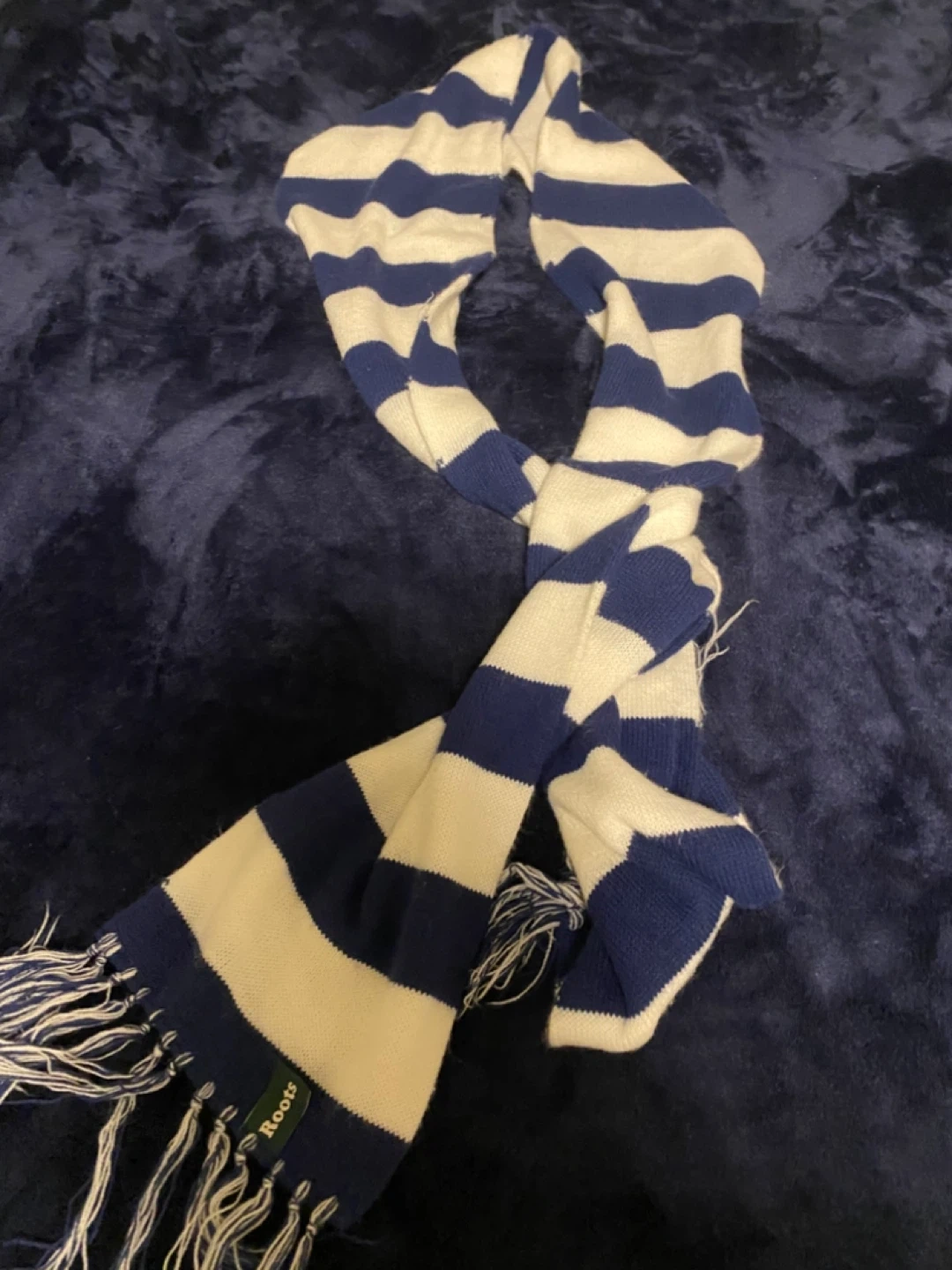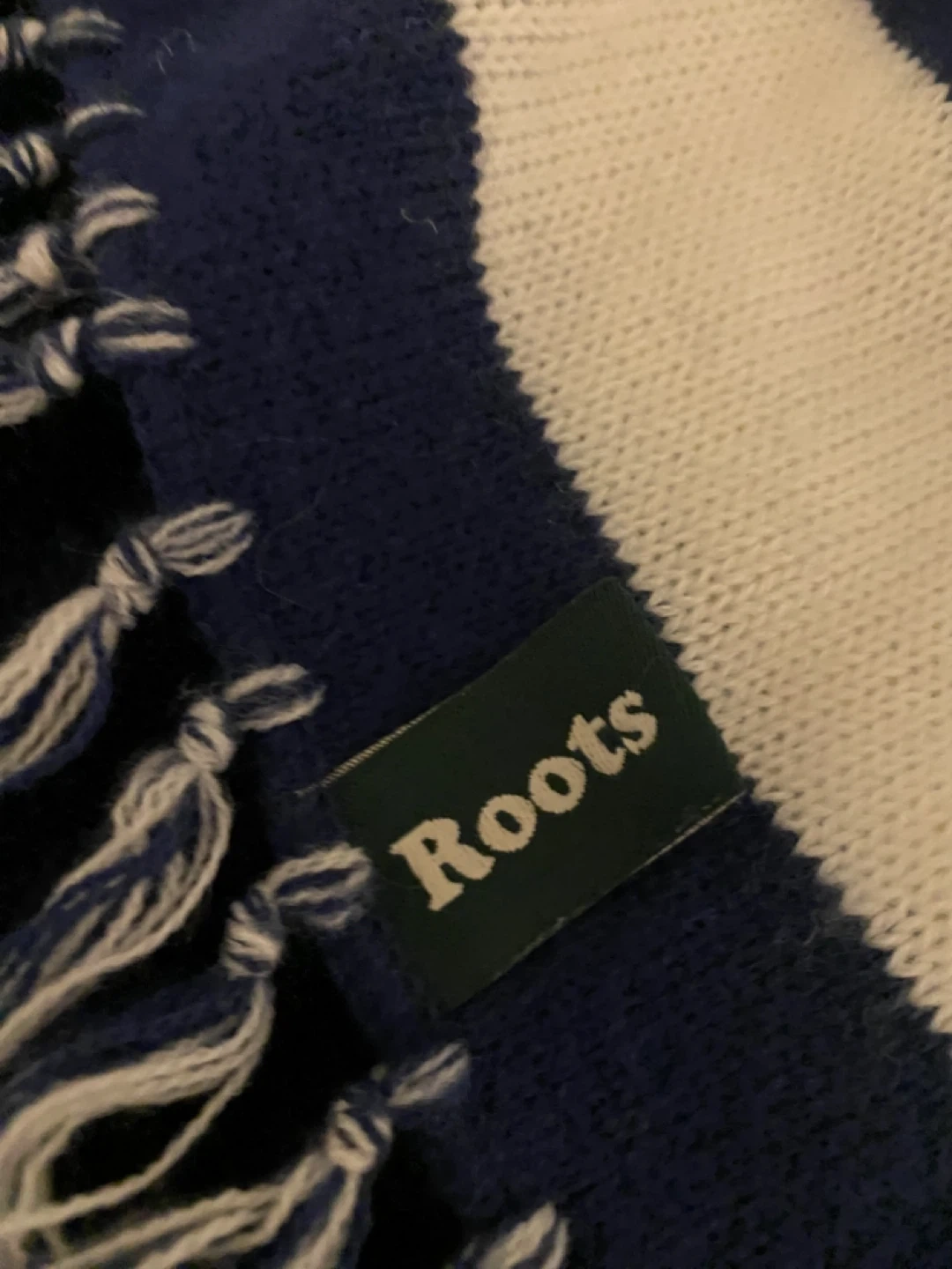 Cozy Roots scarf with a classic blue and white striped design! Features the iconic Roots logo with the polar bear. Perfect for keeping warm during the colder months.