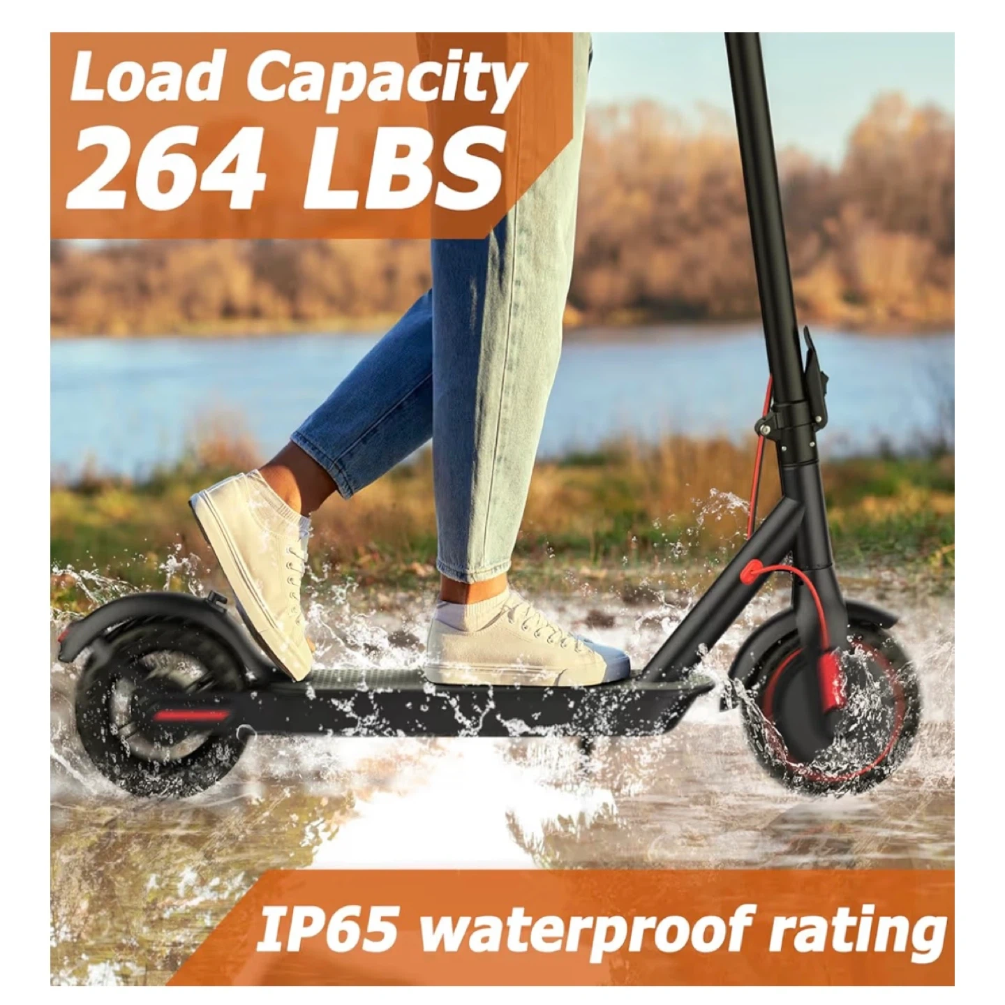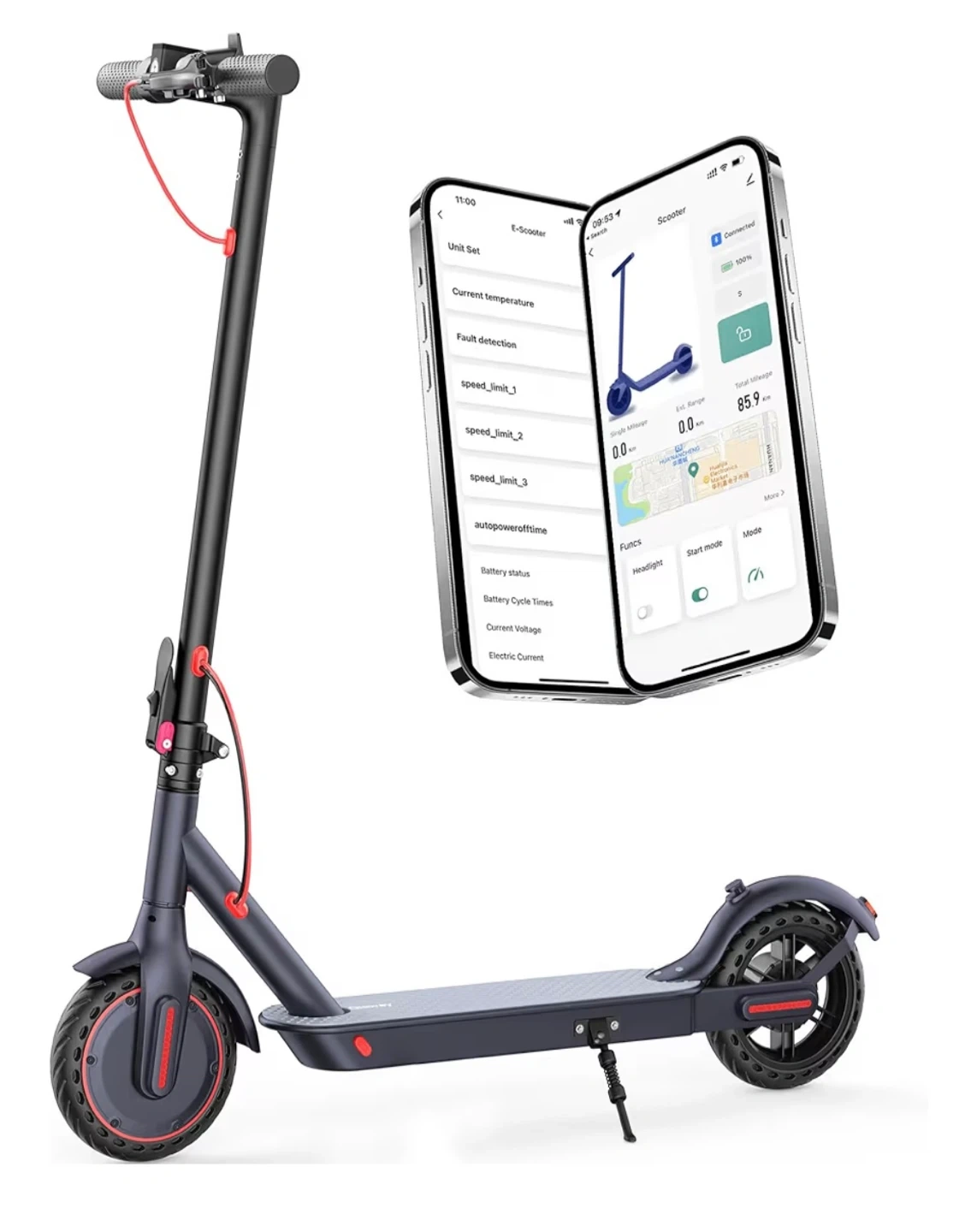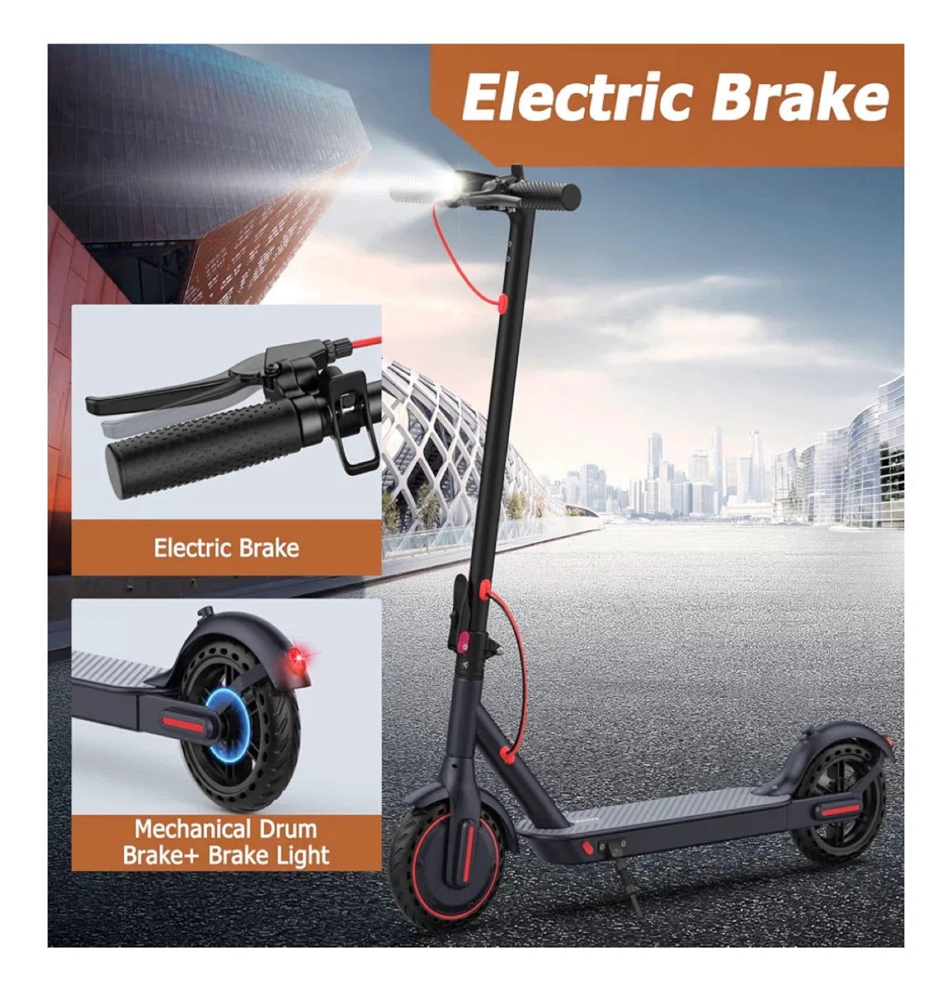 This electric scooter features an electric brake and a mechanical drum brake with a brake light. It also has a one-touch folding design, making it easy to carry and store.